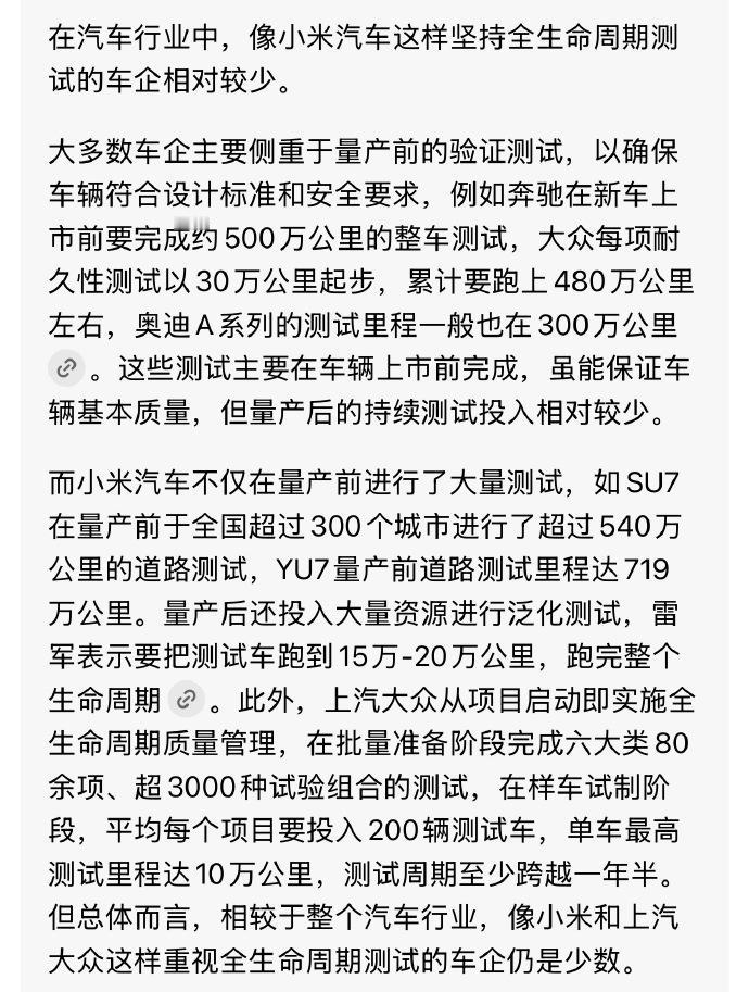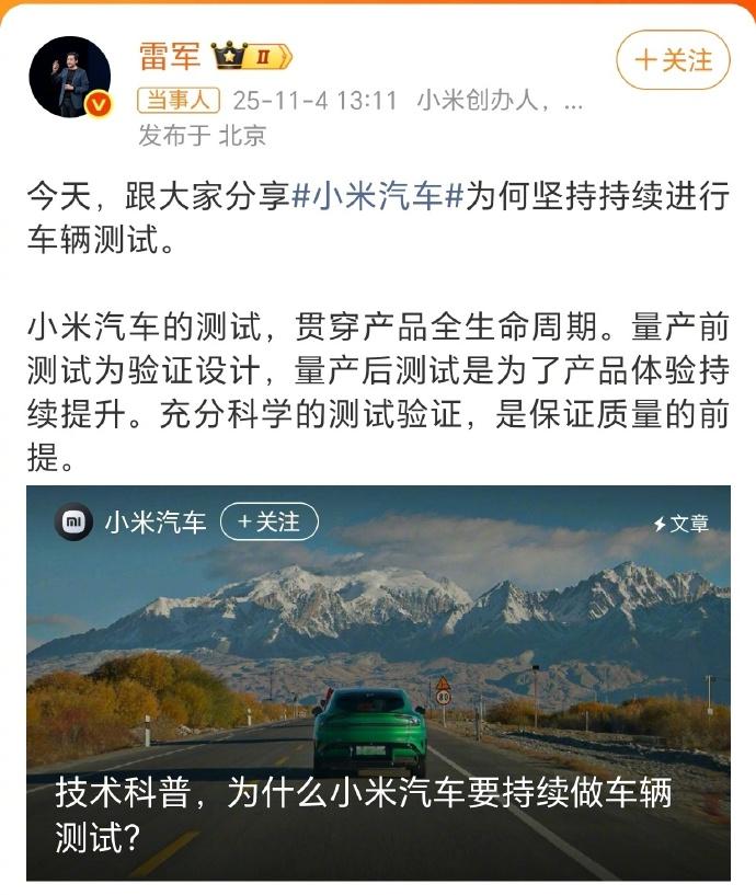 在汽车圈,小米汽车的全生命周期测试确实挺少见的。量产前使劲测,量产了还接着测,这本质是把用户体验当回事,是真想把汽车做好,不是只奔着挣钱去。要知道全周期测试烧钱又费力,雷总还亲自参与,这在国内汽车圈里都挺难得的。 新生车企发展哪能没点问题,大家客观批评没问题,但别抹黑攻击。就像有些人为了博眼球,天天盯着雷总粉丝数搞讽刺,这就没意思了。【来自懂车帝车友圈】