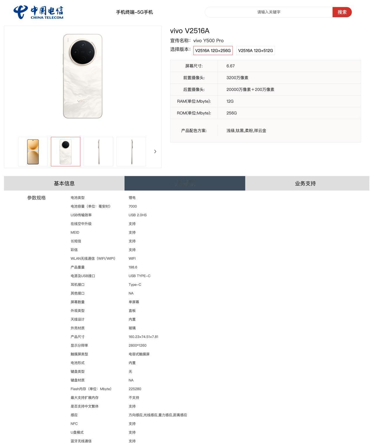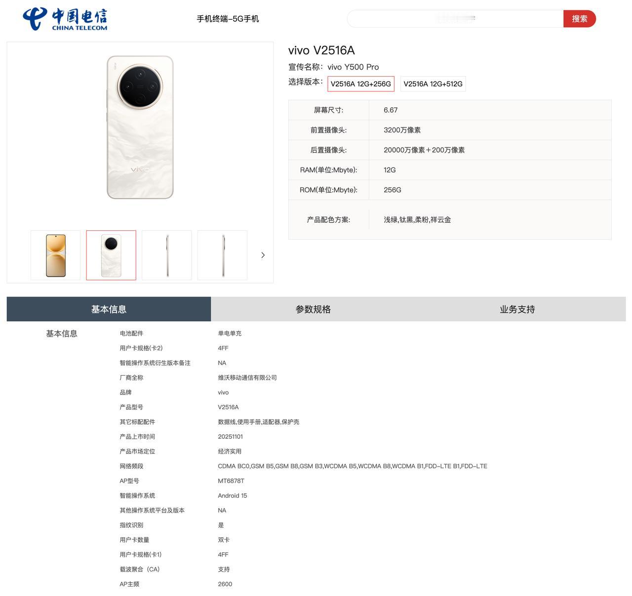 vivo Y500 Pro 提前在电信终端产品库上架了,12+256GB、12+512GB 两个版本,上代12+256GB 售价 2199,今年内存涨价,猜猜售价吧。 - 芯片:联发科天玑 7400 处理器; - 屏幕:6.67 英寸 2800×1260 OLED 直屏; - 相机:前置 32MP,后置 200MP 主摄(三星 S5KHP5,1/1.56")+ 2MP 双摄 - 续航:7000mAh 蓝海电池; - 其他:厚 7.81mm,重 198.6g,浅绿、钛黑、柔粉、祥云金 4 款配色,塑料中框玻璃后盖,OriginOS 6 系统。