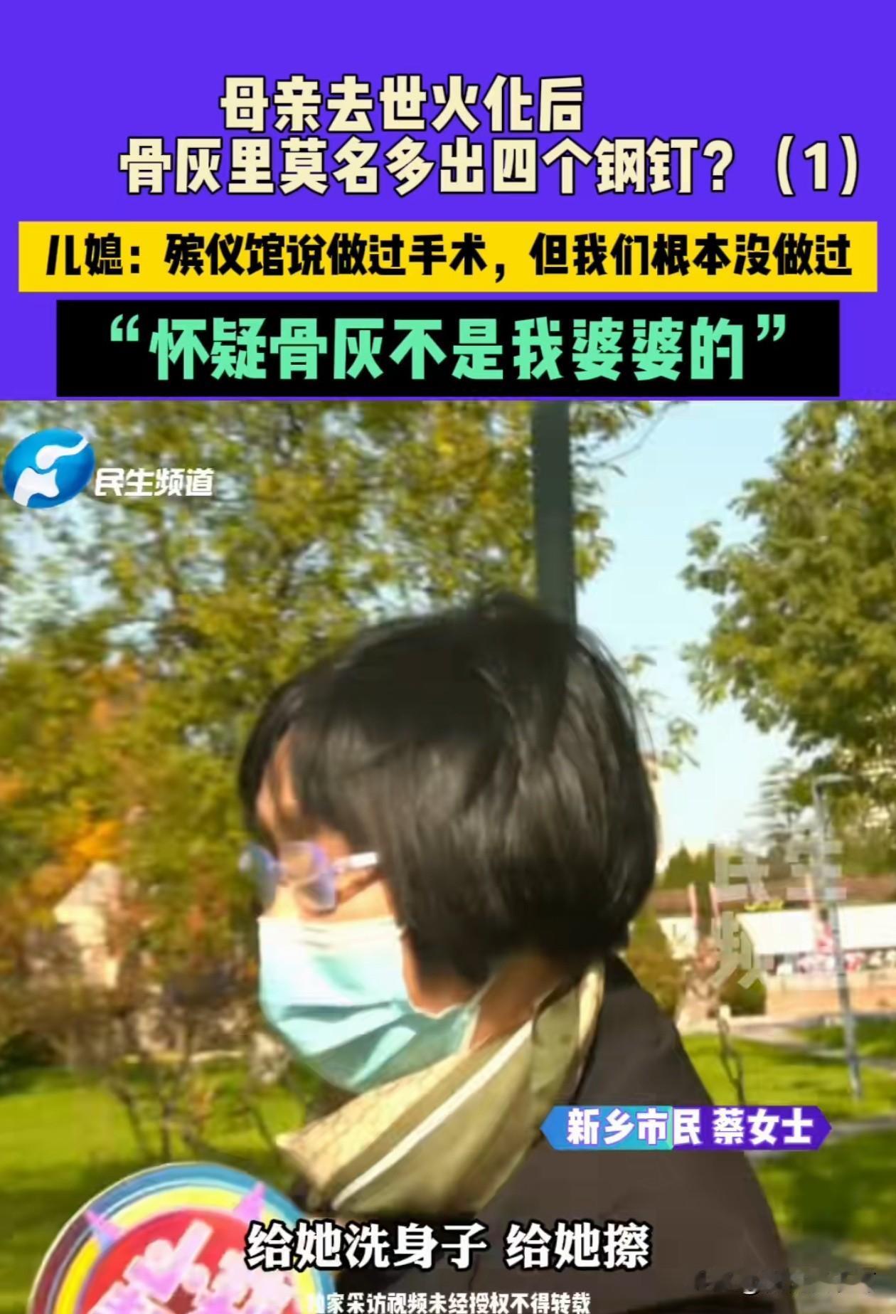 我滴天哪,果然有这种事 新乡市民蔡女士的婆婆去世被火化后,家属取回来的骨灰里面竟然多了四个钢钉,蔡女士表示自己的婆婆生前从未做过任何手术,婆婆生前卧床生病期间,经常给老人擦洗身子,老人身上并没有做过手术的痕迹。 蔡女士伤心的说,这个骨灰就不是她的婆婆,怎么能和她已经去世的公公合葬?! 真是够闹心了,假如没有钢钉这码事,不就稀里糊涂给下葬了!