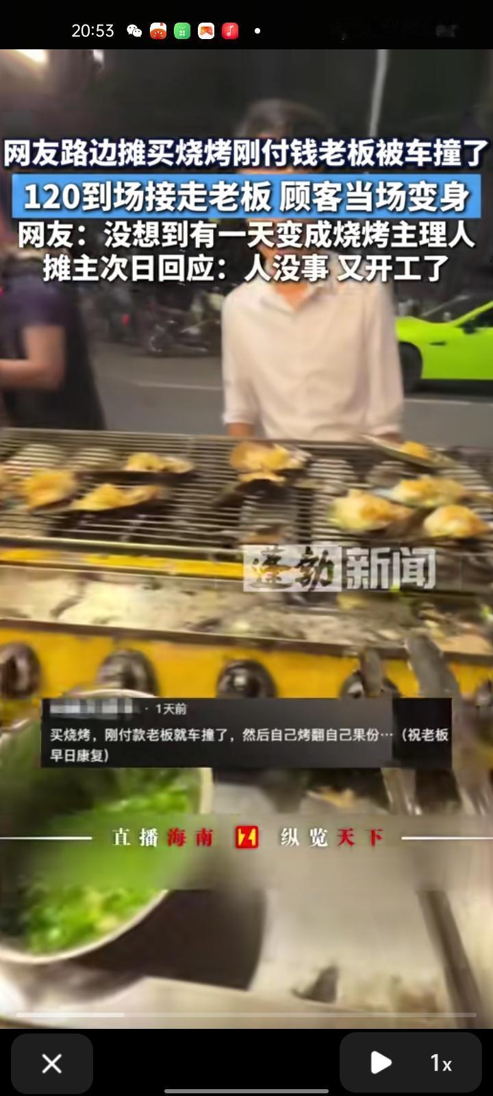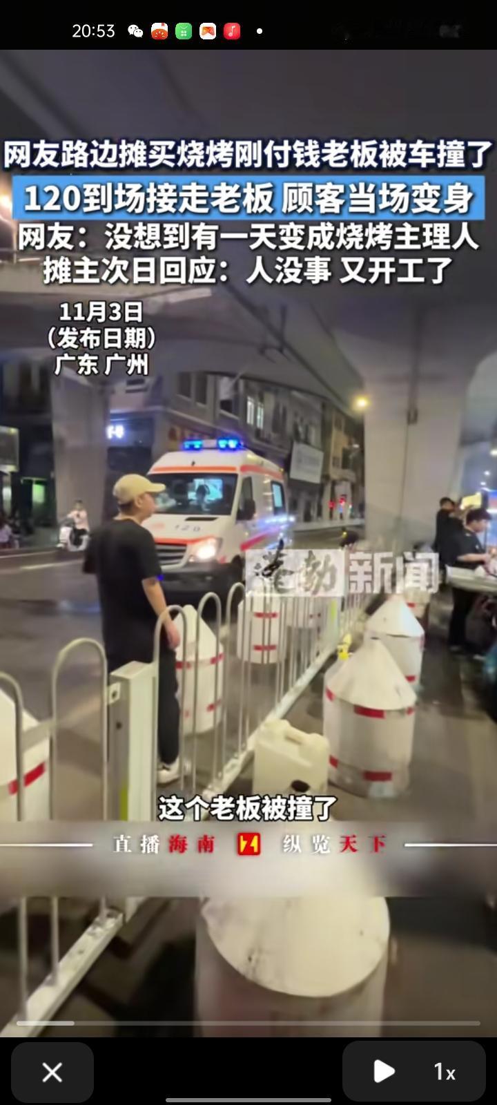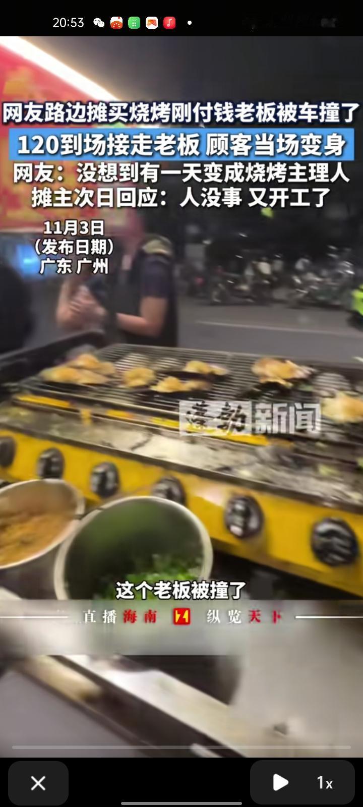 11月2日,广东广州。顾客在路边摊买烧烤,刚付完钱老板就被车撞了,急救车当场接走老板。顾客见状,主动接手摊位,当起 “烧烤主理人” 继续烤制,帮摊主维持生意。次日,摊主回应称已无大碍,已重新开工,感谢网友关心。 视频发出后,引发网友热议,既展现了意外面前的邻里互助与担当,也反映出市井生活中的温暖与善意。