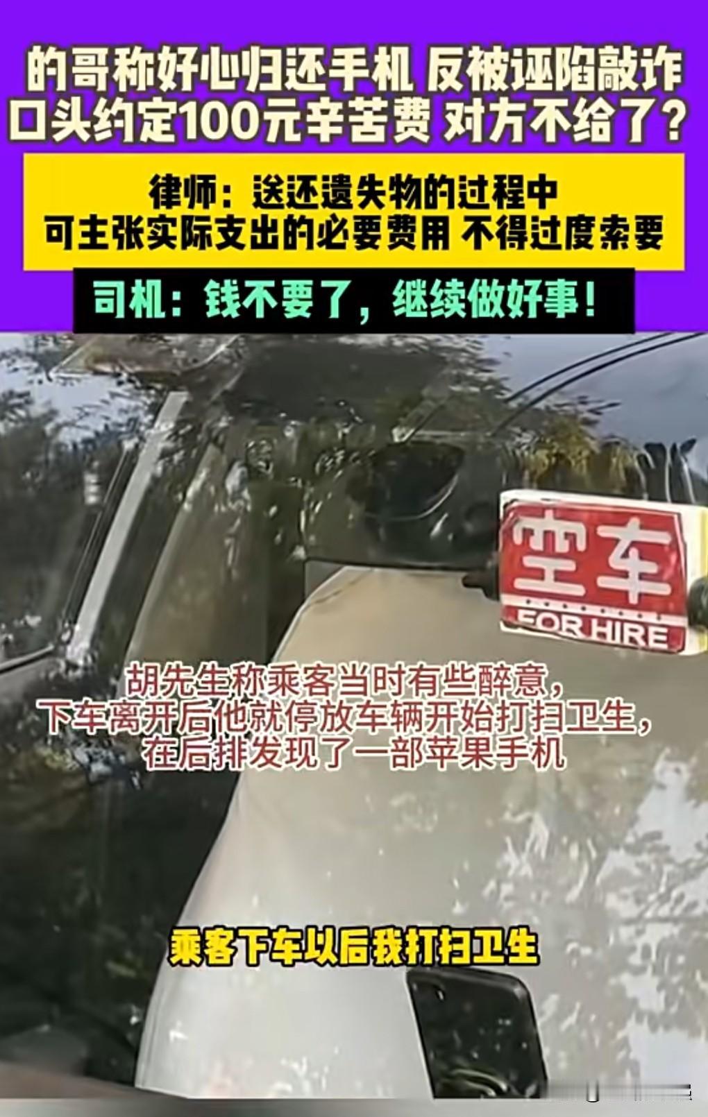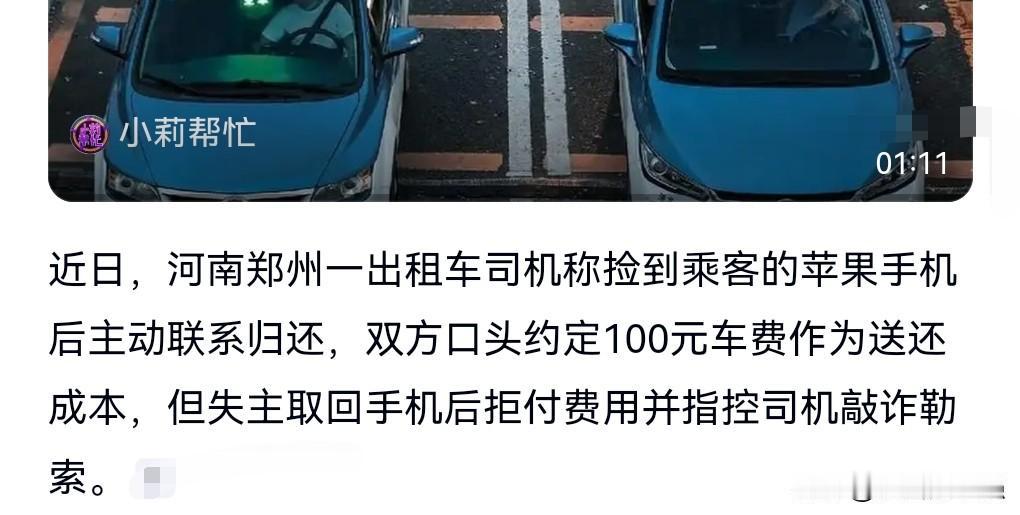 这真的是太缺德了,人要是无耻到这个份上,那真的是挺悲哀的。 近日报道,的哥称好心归还手机反被诬陷敲诈。 失主把手机落在车上了。 说好的归还手机后,失主要给的哥100块钱,毕竟来回的油费也是要的。 没想到失主拿上手机后,竟然不给了。 并且还诬陷的哥敲诈。 这真的是离谱。 这样的失主实在是人品太次了。