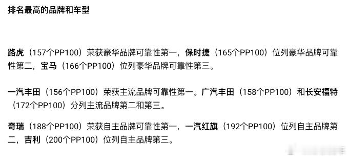 主流品牌第一仍然是丰田的双子星,一汽丰田和广汽丰田分别以156个PP100和158个PP100位列第一第二,继续把“稳定”做到行业天花板。