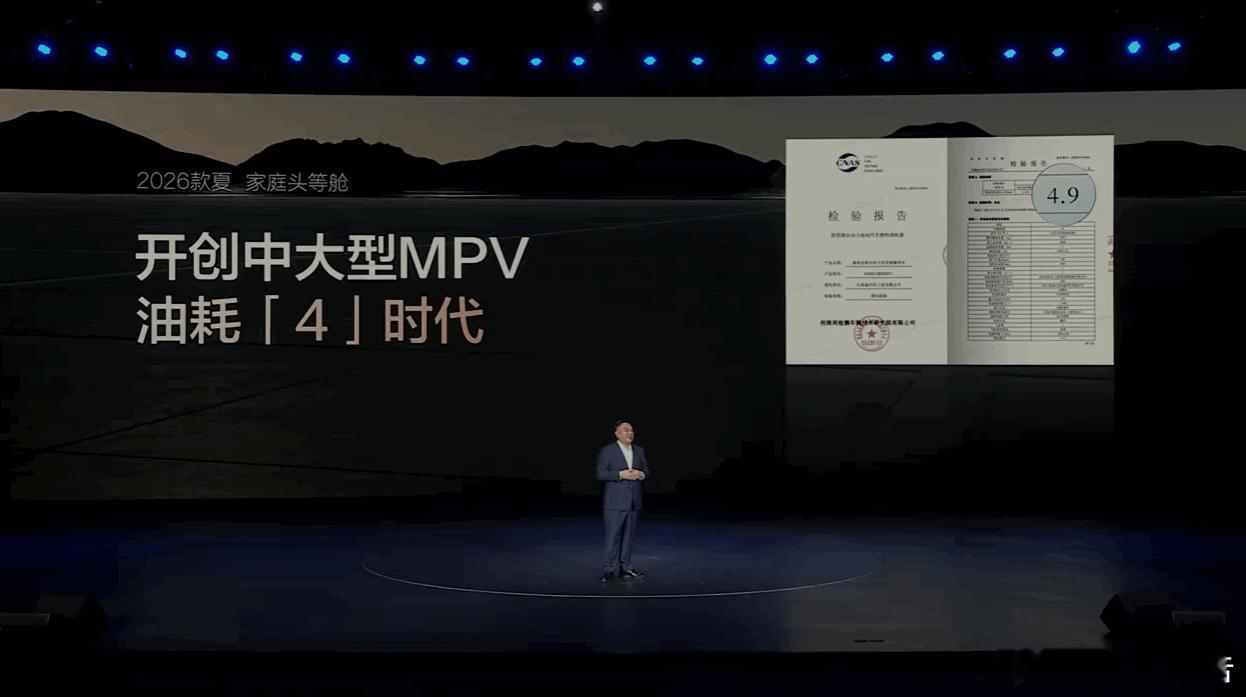 动力方面,新车搭载有1.5T发动机和电机组成的比亚迪第五代DM技术,现款车型的馈电油耗为5.3L/100km,但2026款车型持续进化,NEDC馈电油耗降至4.9L/100km,比很多燃油家轿还低,开创中大型MPV油耗的4L时代。