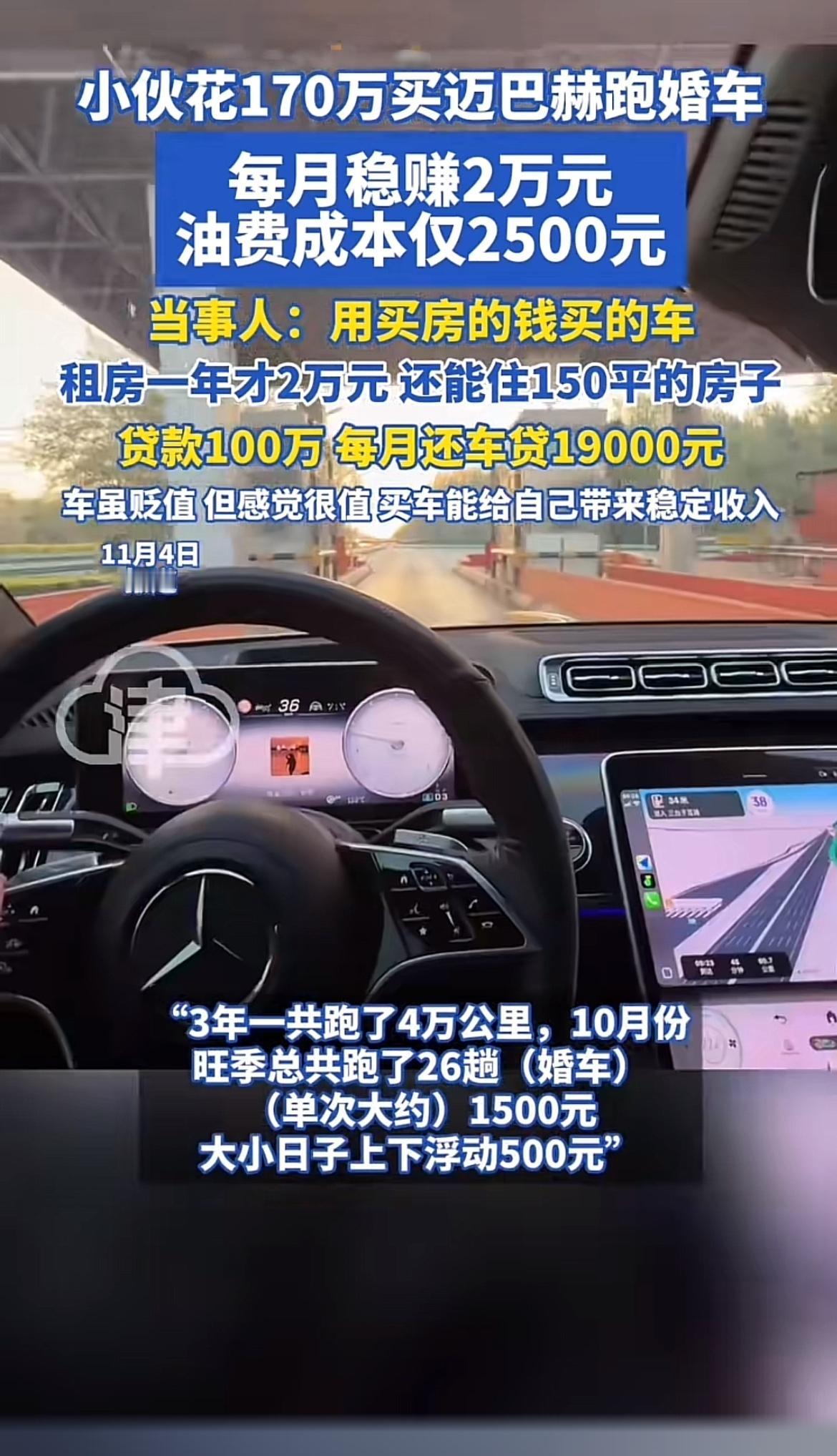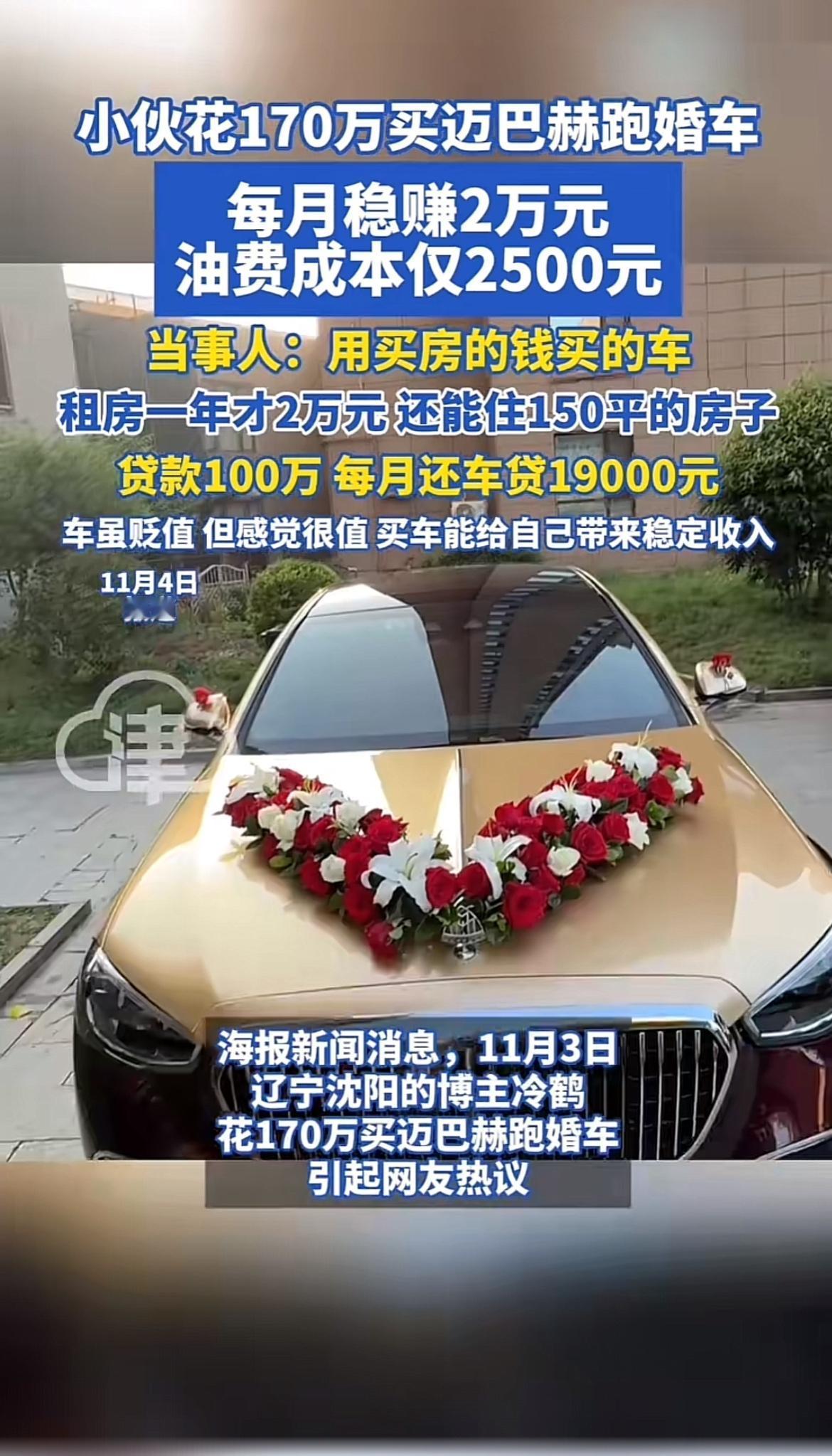 最近“小伙花170万买迈巴赫跑婚车”火了。辽宁沈阳25岁的冷鹤贷款100万买了车,每月还车贷19000元。原本这钱是用来买婚房的,但他觉得沈阳租房成本低,150平一年才2万,而买车能有稳定收入。 10月旺季他跑了26趟婚车,一趟约1500元,淡季上下浮动500元,再加上商务接待,月入2万。成本也不高,每月油费最多2500元。不过有网友质疑,10月接26单,感觉像天天都是好日子,有点不真实。但不管怎样,他这想法和操作确实挺大胆。