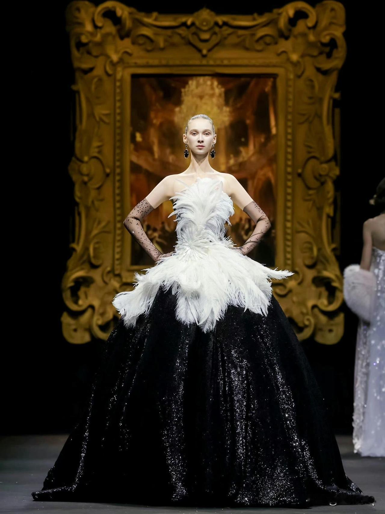 林允身穿一袭白色羽毛抹胸黑色亮片长裙亮相微博视界大会,完全就是一只高贵的天鹅。不过模特穿得也很漂亮,我甚至觉得外籍模特比林允诠释得更加精彩。