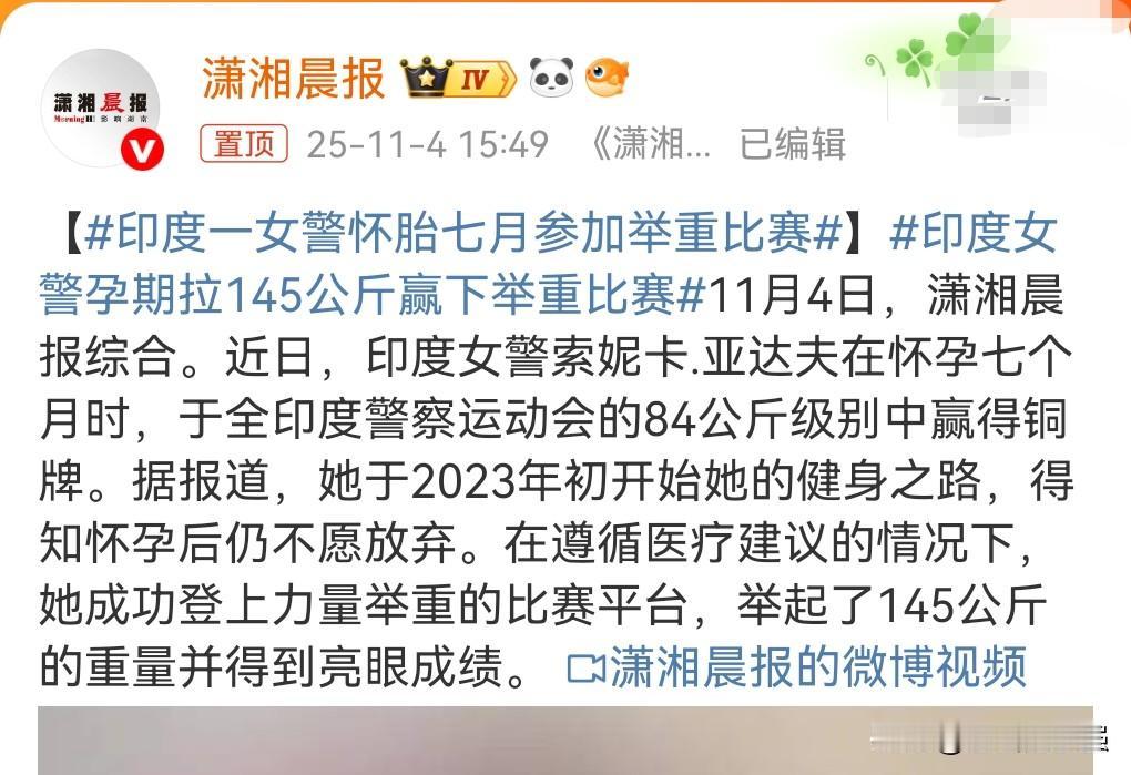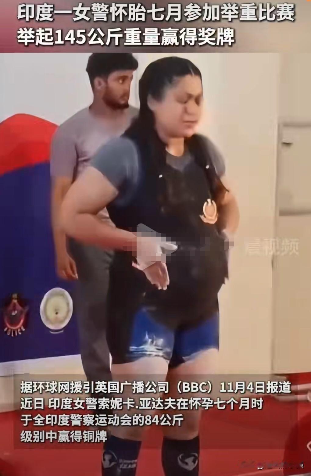这真是太离谱了,这个比赛难道就非参加不可吗? 11月4日在网上看到一个很离谱的消息,印度一女警怀胎七月参加举重比赛。 这真是一点都不把肚中的婴儿当回事啊,怀孕7个月了,竟然参加举重比赛,这也太不负责任了吧。 不过值得一提的是,这女子竟然还获得了铜牌。 那也是挺厉害的。