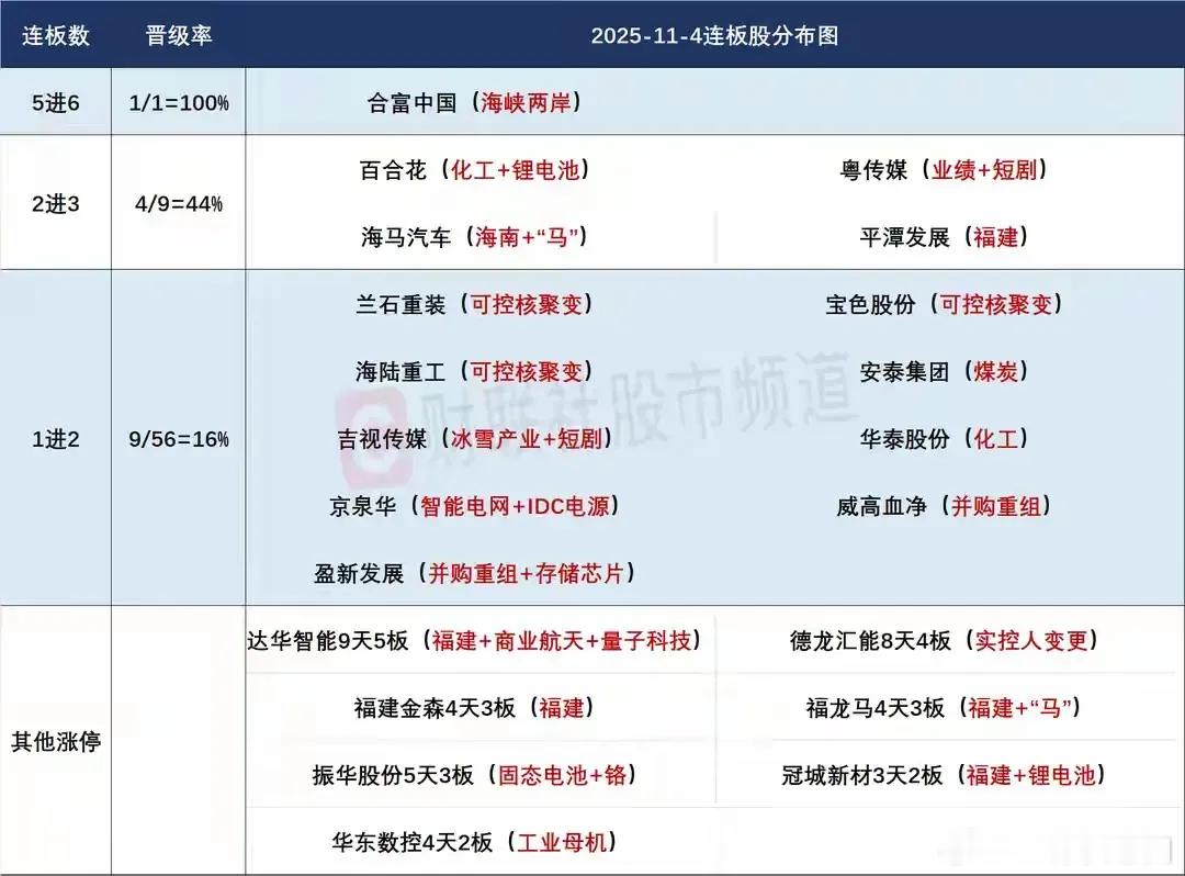- 平潭(5板):虽然不是最高标,但它成功挑战过监管,具备高辨识度。它与合富形成相互影响的格局,两者的竞价表现需结合观察。只要其中一只表现强势,另一只只要符合预期,就可能获得资金青睐。