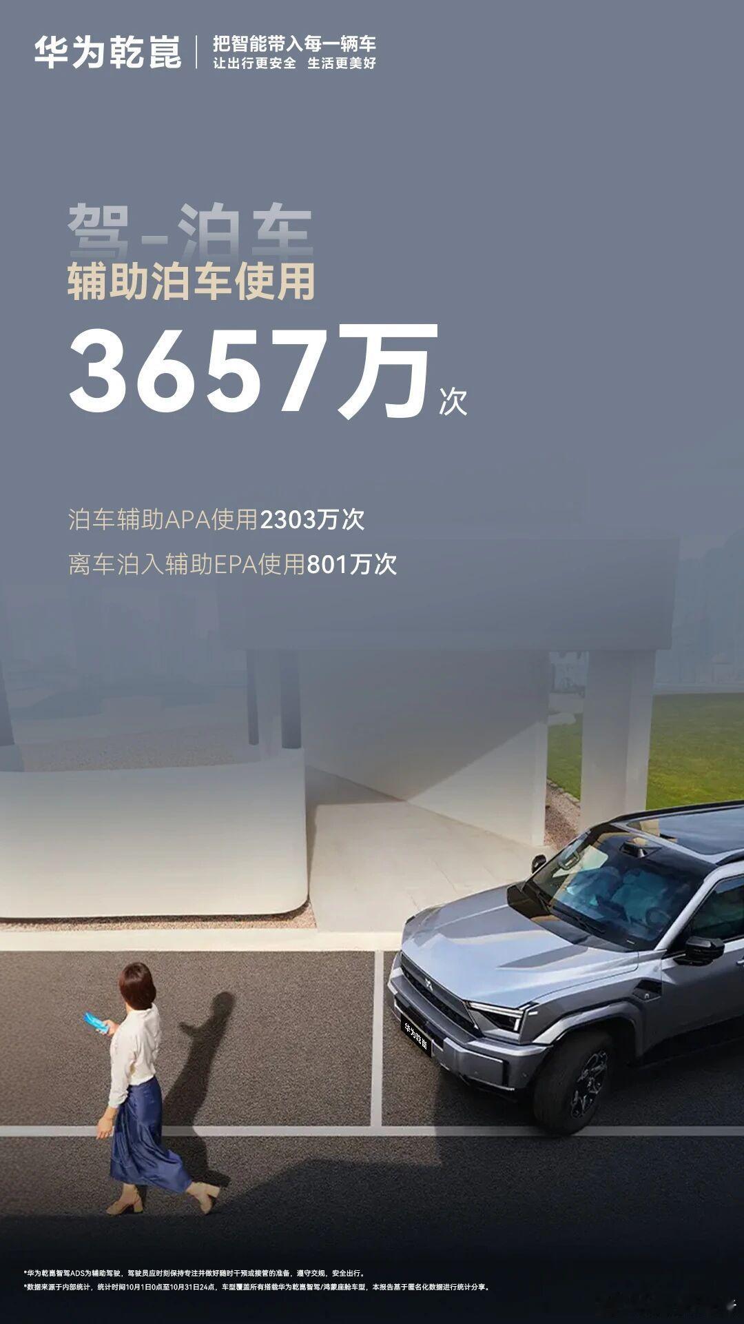 10月期间,华为乾崑辅助驾驶累计行驶6.8亿公里,相当于绕地球1.7万圈;辅助泊车使用3657万次,轻松泊车,一步到位;主动避免可能的碰撞26.4万次,为每一次出行保驾护航;语音助手唤醒3.4亿次,智慧交互,懂你所需,全程贴心相伴。