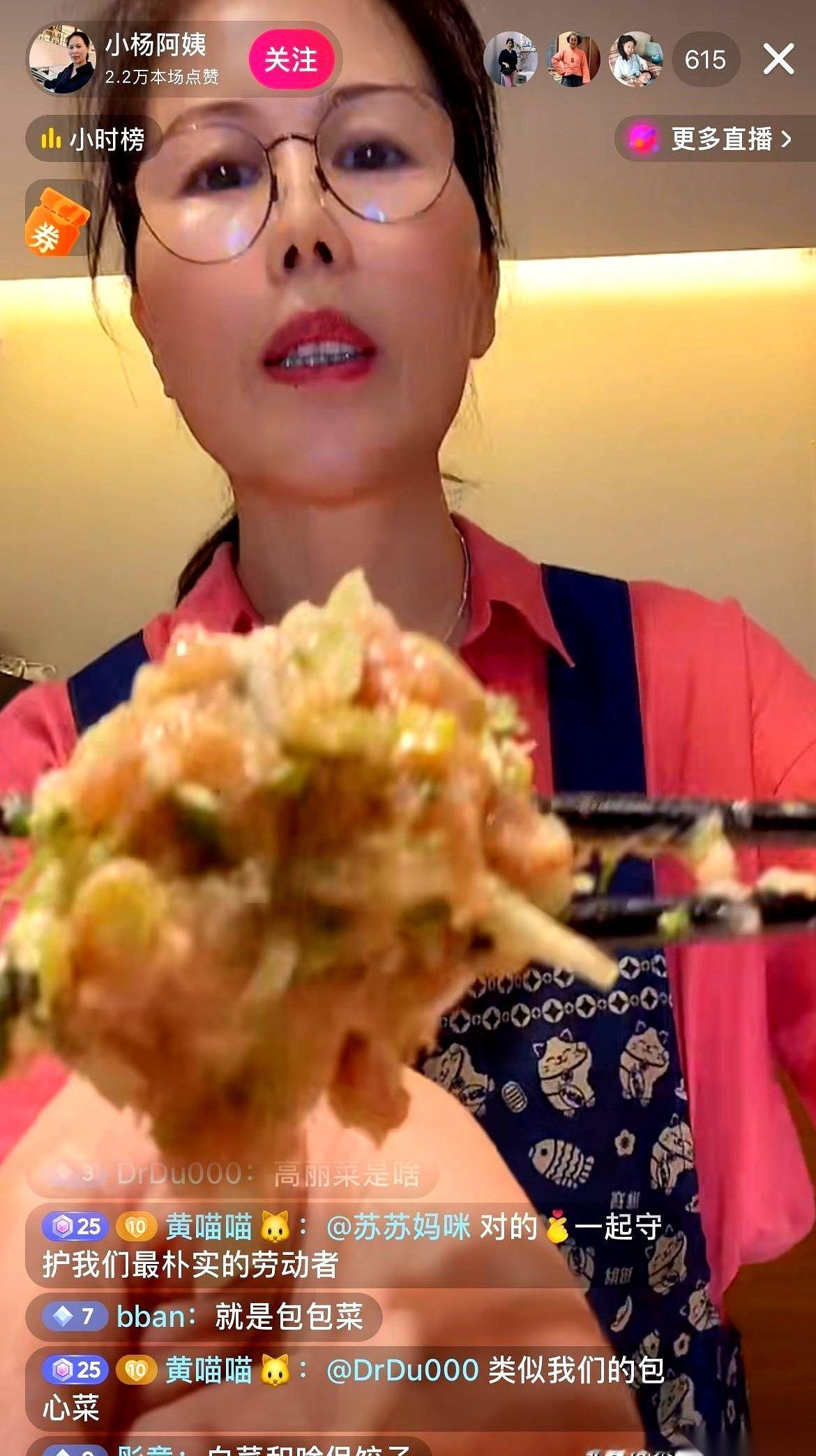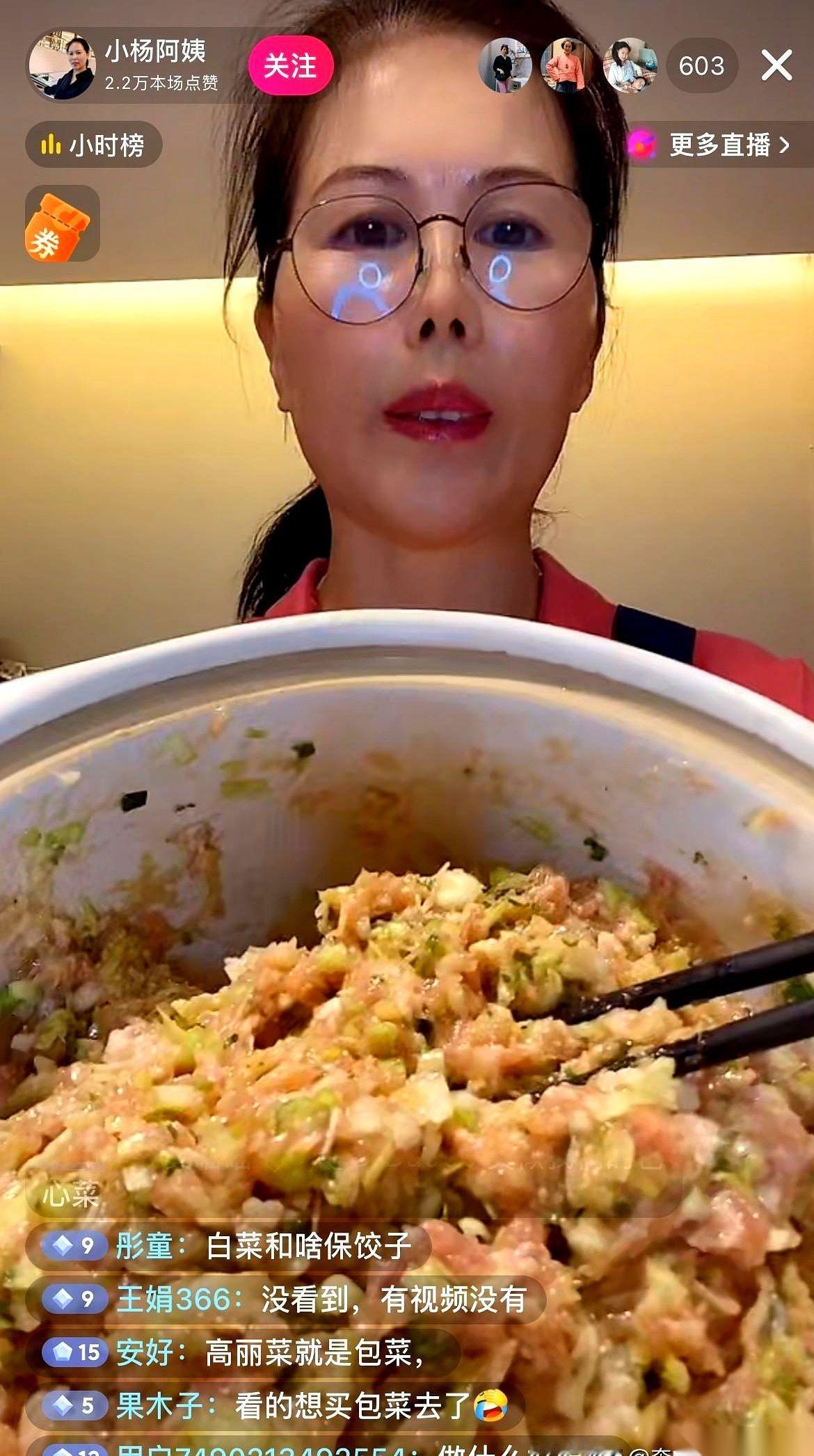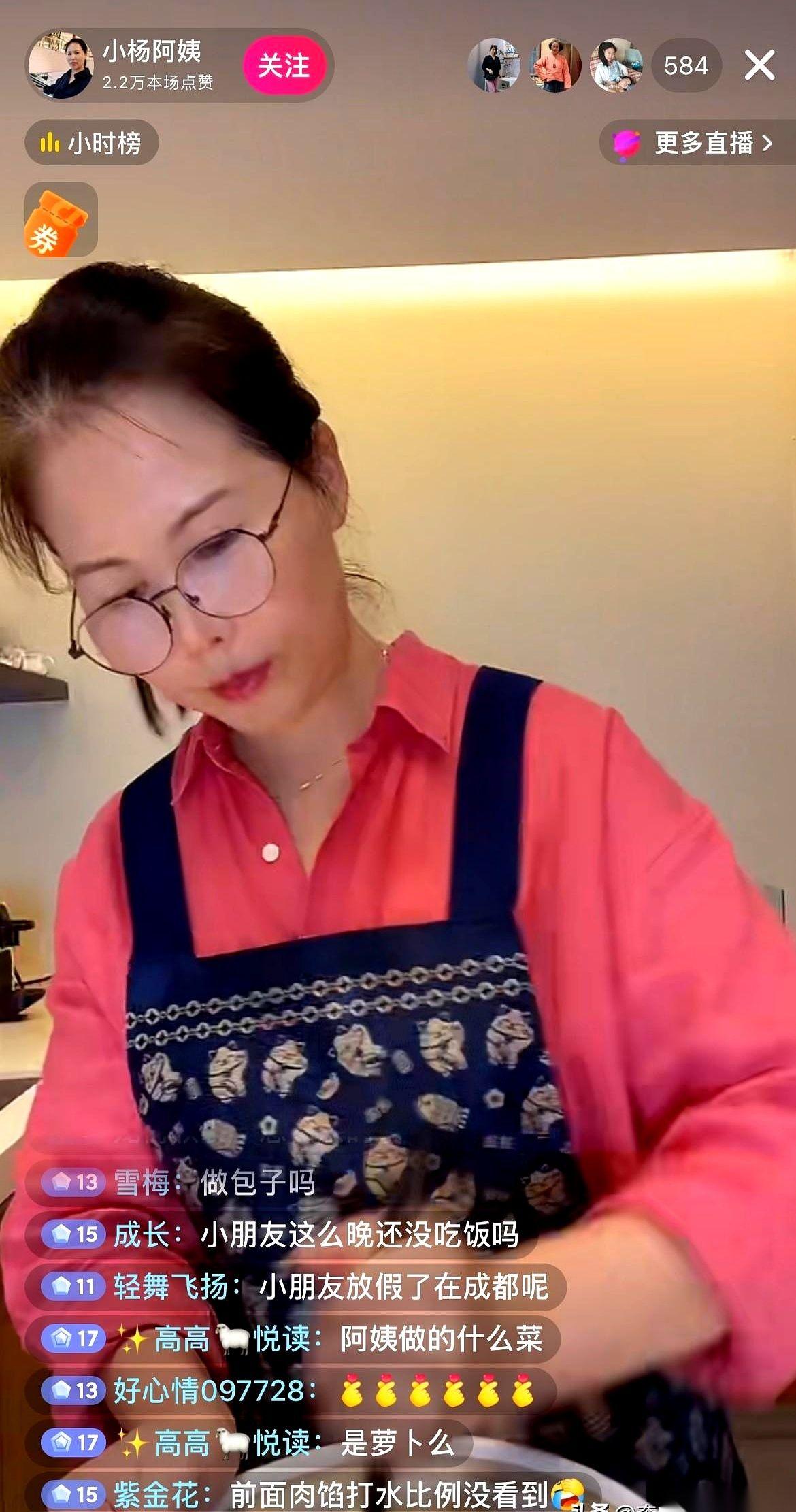 “姐妹们,小杨阿姨没那么老,我这说得嗓子都快干冒烟了,哪还有口水呀!” 哈哈哈哈,刷到小杨阿姨直播,差点没给我笑喷了。 有网友让她戴个口罩,怕她调馅儿的时候口水溅进去。 她直接回了这么一句。 你说这劲儿,又好笑又有点扎心。 这才是活生生的人啊。 前两天给娃煲汤,手还被烫了,流了好多血。现在娃放假回成都了,她一个人在家,也没闲着。 今天包饺子,明天包馄饨,塞满冰箱。 等娃下周回来,早餐就有了着落。 很多人可能觉得,不就是做点吃的吗? 不,你没看懂。 这是一种肌肉记忆,一种刻在骨子里的母性。 只要孩子不在眼前,她们的身体就会自动切换到“为下一次见面储存能量”的模式。 她们嘴上说着“哎呀累死了”“嗓子都干了”,手上的活儿却一刻都没停过。 直播,对她来说可能都不是工作。 那只是一个窗口,让她在重复的、充满爱意的劳动里,能跟外面的人唠唠嗑,透口气。 说白了,她不是在直播包饺子。 她是在直播一种我们再熟悉不过的,妈妈的爱。