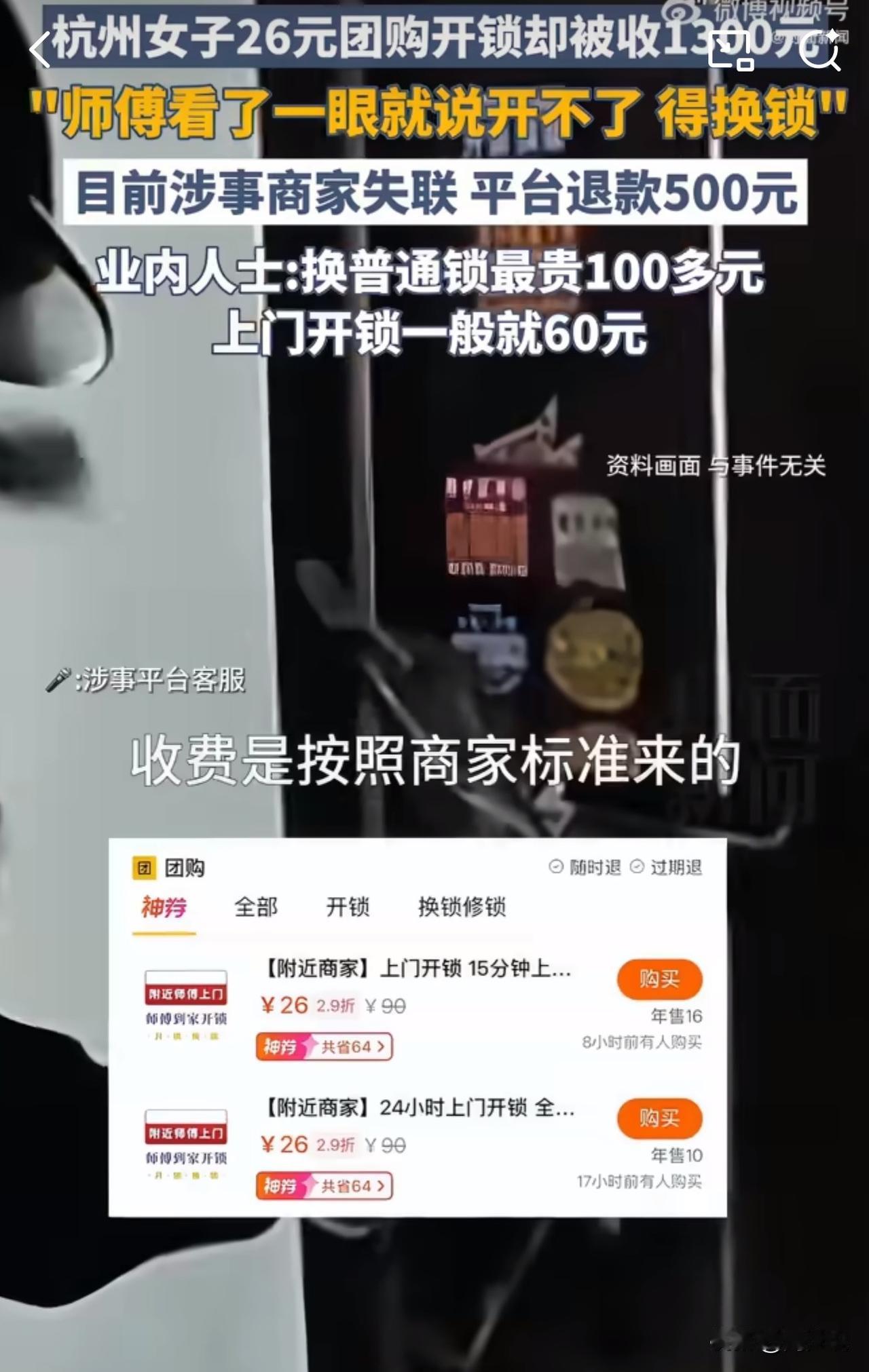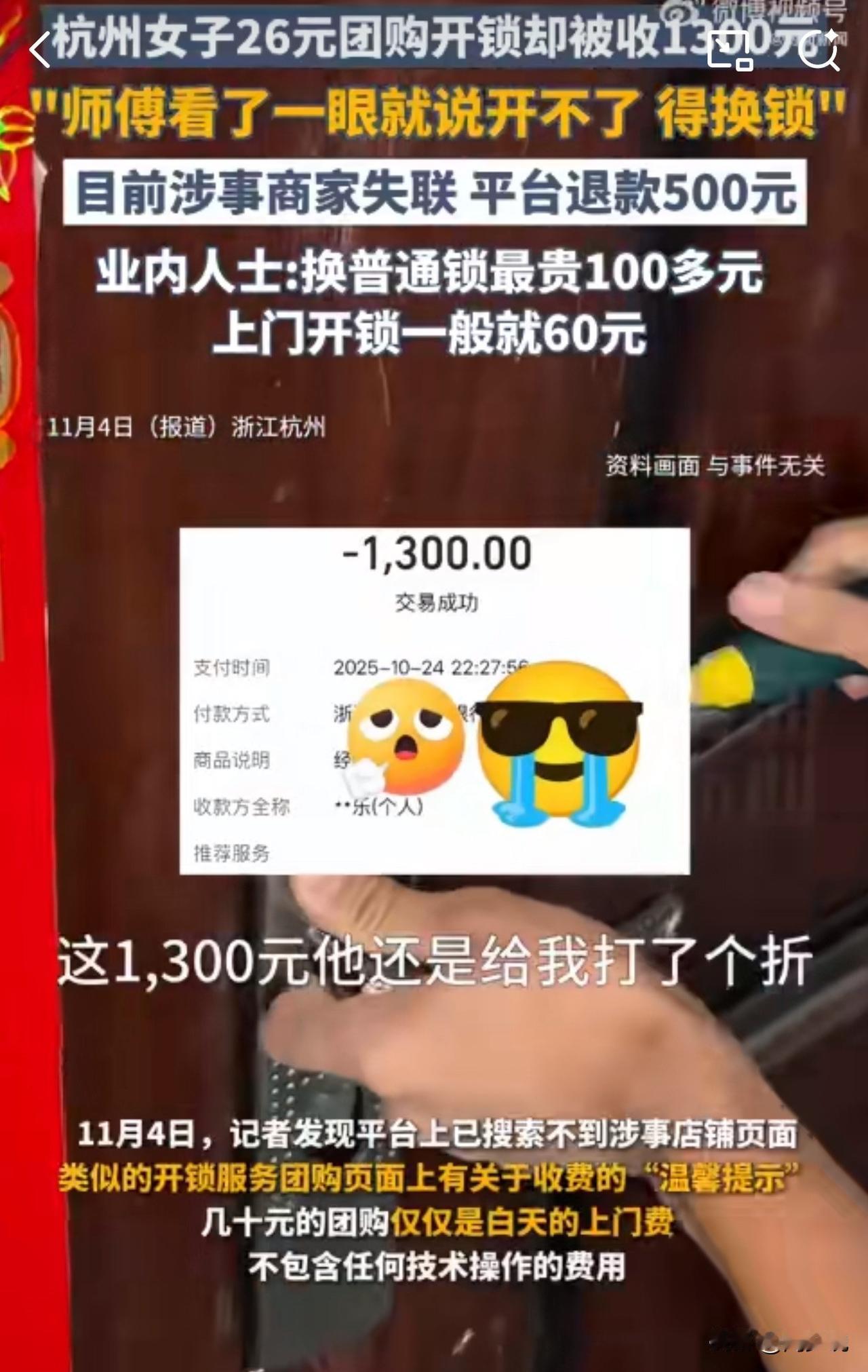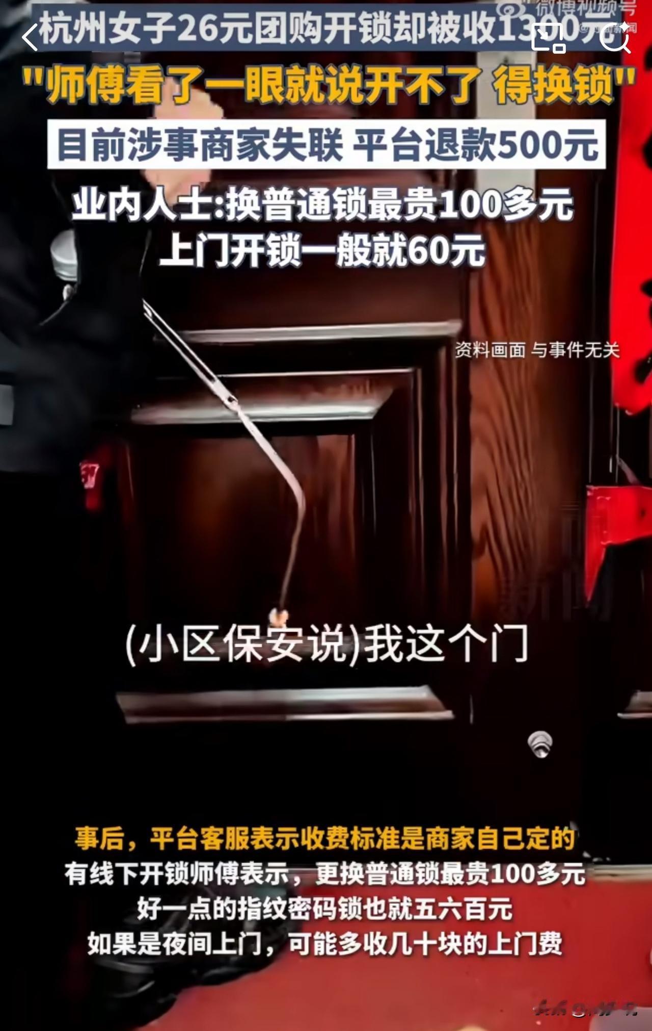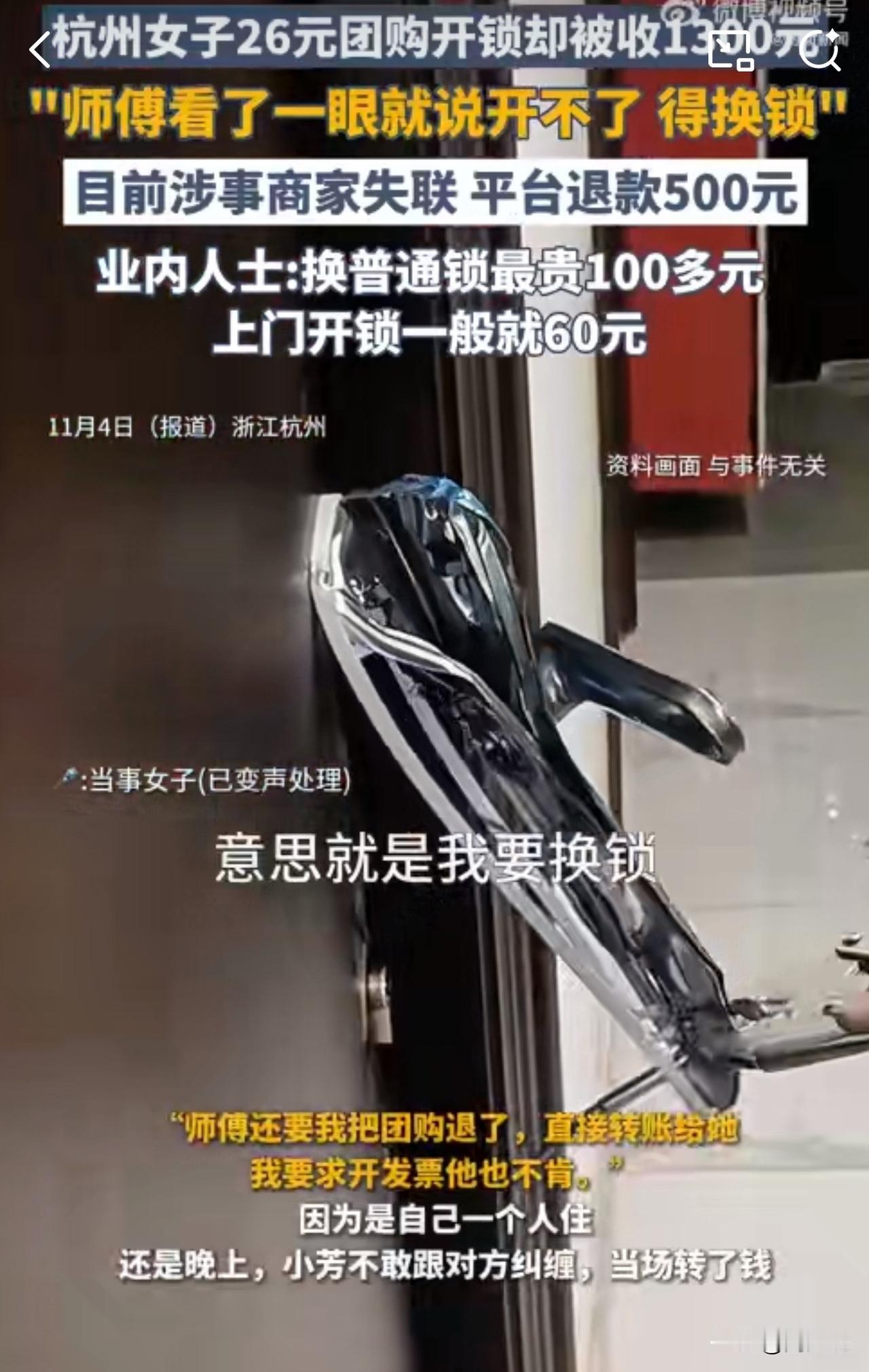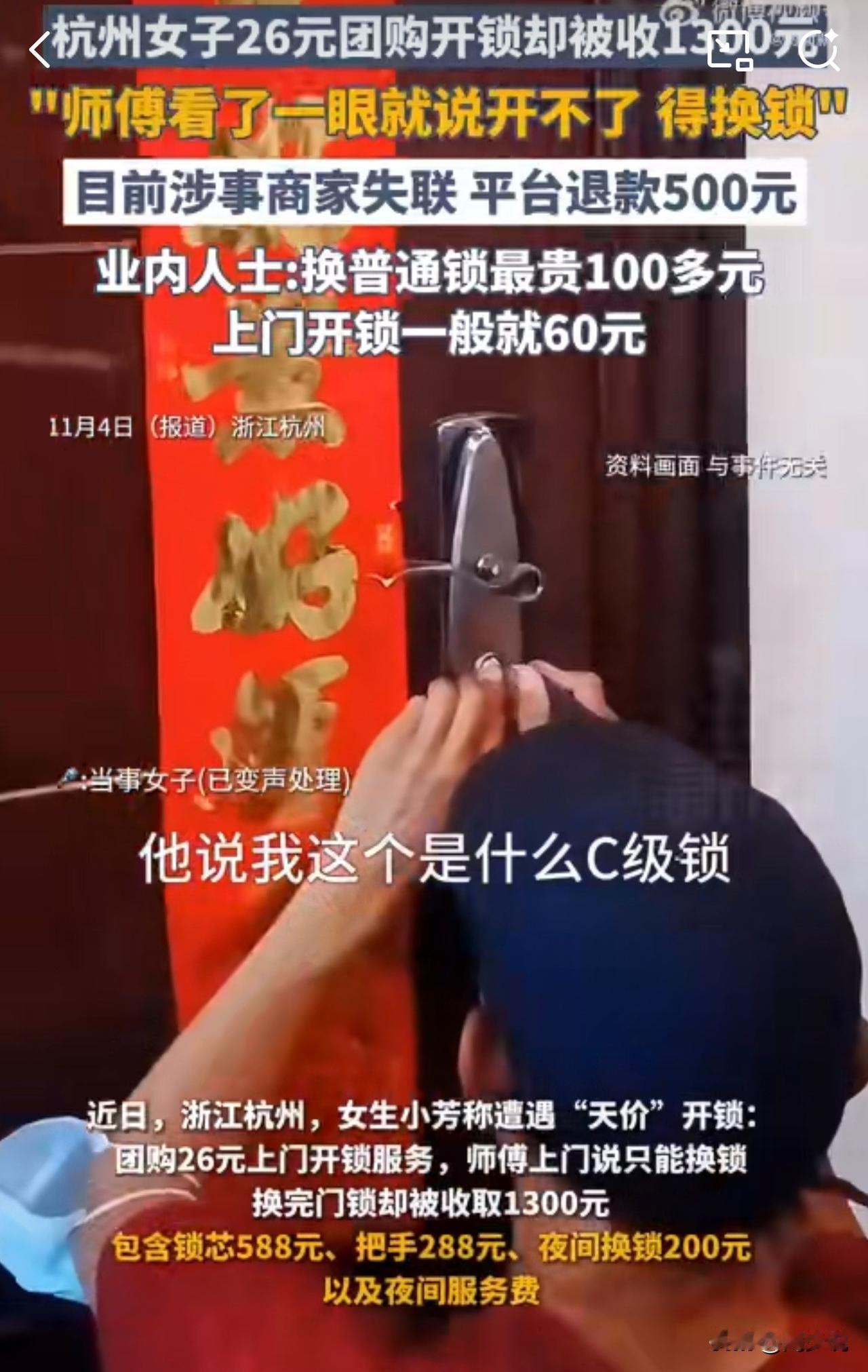 26元开锁变1300元!杭州女生深夜遇“套路”,商家一句话让人气愤! 近日,浙江杭州女生小芳的遭遇引发热议。她团购了26元的上门开锁服务,可师傅上门后,却以换锁为由向她收取1300元。 小芳称,自己独居且是深夜,不敢和对方纠缠,只能当场转账。师傅还说1300元是折后价,包含588元锁芯、288元把手、200元夜间换锁费及服务费,还让她退了团购直接私下转账,索要发票也被拒绝。 11月4日,记者发现涉事店铺已在平台搜不到。平台回应称,收费标准由商家自定,平台无限制,之后为小芳退回500元,目前小芳仍在进一步投诉。 此事引起网友热议,有网友说:“这就是明摆着的套路!利用独居女生深夜的顾虑坐地起价”! 也有网友质疑:“平台说无限制也太不负责任了,监管何在?” 还有网友则表示:“26元就是引流陷阱,必须严查这种黑商家”。 在周少看来,其实26元低价团购明显是引流噱头,商家借深夜、独居等场景强制高价消费,实属霸王条款。 平台推脱监管责任的态度更令人不满,消费者的权益不能只靠自身警惕,平台和相关部门应加强监管,严查此类套路营销,避免更多人被坑。 对于这样的情况,大家有遇见过吗?#寻美三湘# #长沙新朋友#