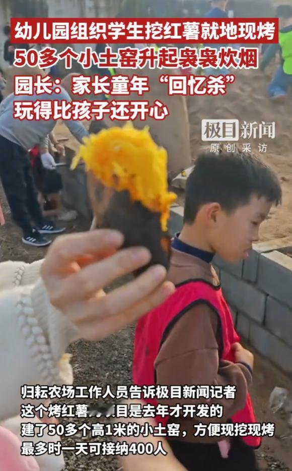 “太接地气了!”11月4日,山东郯城县,一家幼儿园的80多个家庭来到日照天台山归耘农场,参加户外研学,孩子们放下平板电脑,拿起小铲子走进田间,挖红薯烤红薯,几十个小土窖升起炊烟,网友:家长比孩子玩的快乐。[得意] 农场里50多个一米高的小土窑格外热闹,家长们蹲在土窑边烤红薯,脸上洋溢着孩子般的笑容,挖红薯、垒土窑、生火烤制,每个环节都让他们格外投入,亲子一起体验从土地到食物的完整过程。 王园长介绍,这类活动已持续近两年,初衷是让孩子远离电子屏幕,走进自然,结果家长们的参与热情异常高涨,有家长直言自己比孩子还期待下次活动。 归耘农场工作人员表示去年推出的烤红薯项目已成最受欢迎项目,游客多时土窑需要排队使用,除烤红薯外,农场还有稻田观察、萌宠互动等项目。 这种亲子共玩模式不仅增进家庭互动,更让家长在陪伴中放松身心,网友纷纷留言称赞这种带着烟火气的童年体验,正是现在很多孩子缺失的珍贵记忆。 看着孩子们在田埂上奔跑,家长们猫着腰在土窑边忙活,这充满烟火气的画面不仅在现场带来了欢笑,也通过互联网温暖了无数人,活动视频发布后,迅速引发了网友们的热烈讨论。 “这幼儿园太会来事儿了!现在城里孩子确实需要这样的体验,比玩iPad强多了。” “羡慕两个字我已经说累了,我小时候怎么没有这么好的活动?” “那个小土窑看着就亲切,瞬间想起我奶奶在地里给我们烤红薯的时光。” “说实话,现在很多家长自己也缺乏自然体验,这个活动真是两代人都受益。” “我们小区要是能组织一下就好了,立马给我家娃报名!” “现在的孩子太需要这种接地气的教育了,天天关在楼房里都失去童真了。” “作为90后,看到这个视频差点哭出来,这就是我们小时候的快乐啊。” “这个农场考虑得很周到,50多个土窑能保证每家都能体验到位。” “这种亲子活动太有意义了,既增进感情又能学到知识,一举两得。” “建议全国幼儿园推广!让孩子知道红薯是长在地里的,不是长在超市的。” “看着家长们比孩子还开心,突然理解了传承的意义。” “这才是真正的素质教育,比报多少个兴趣班都强。” "这才是真正的早教!比起那些昂贵的早教班,这种接地气的活动对孩子成长更有帮助。" "看到家长们笑得那么开心,突然觉得幸福其实很简单,就是陪孩子一起做件有意义的小事。" "希望这样的活动能常态化,每个月组织一次都不嫌多!" "作为两个孩子的妈妈,真心觉得现在的孩子缺少这种'脏兮兮'的快乐。" "这个幼儿园的园长太有想法了,能把教育活动做得这么有趣,点个赞!" "想起了小时候在乡下外婆家,也是这样烤红薯,那时候觉得是全天下最美味的食物。" 如果你家孩子的学校也组织这样的活动,你最期待哪个环节?是亲手挖出红薯的惊喜,还是围在土窑边等待美食的期待?快来评论区聊聊你的想法吧! 信源:极目新闻