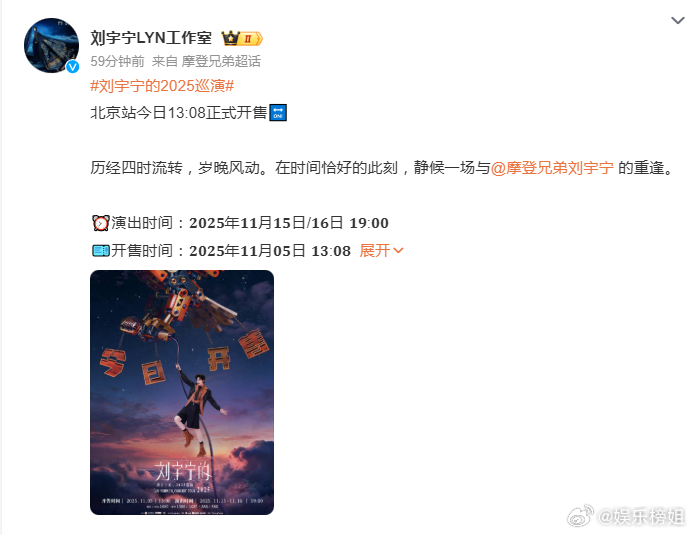 刘宇宁北京站今日开售刘宇宁11月15日-16日北京站演唱会今日13:08分正式开售,祝大家都能如愿抢到票,加油冲冲冲[打call][打call][打call]刘宇宁的2025巡演 ​​​