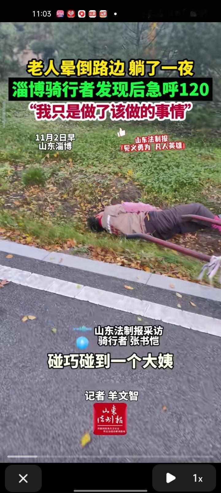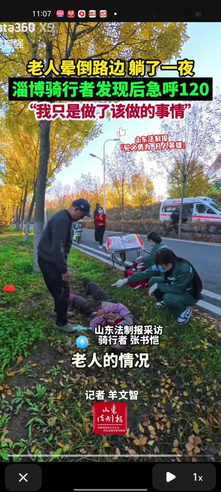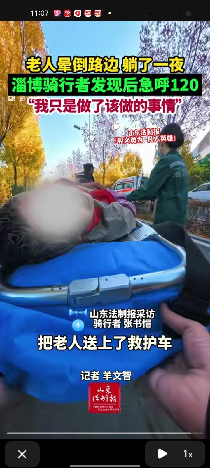 11月2日,山东淄博。骑行者张书恺在绿道骑行时发现一位阿姨躺在绿化带,感觉不太对就上前询问,阿姨有点反应但是起不来,她说是前天晚上六七点钟晕倒的,之后在外边待了12个小时。张书恺拨打120后就在原地等待,刚好有几人认识大姨,也联系了家里人。急救人员到场后,他简单说明阿姨的情况,然后把阿姨抬上救护车。