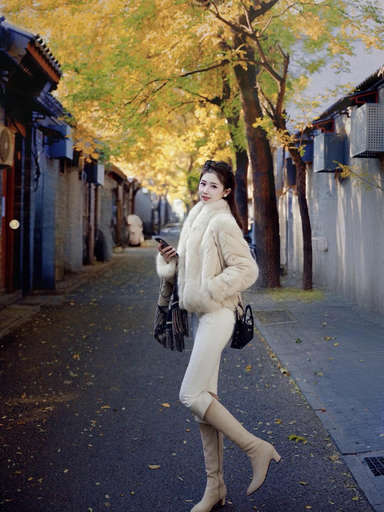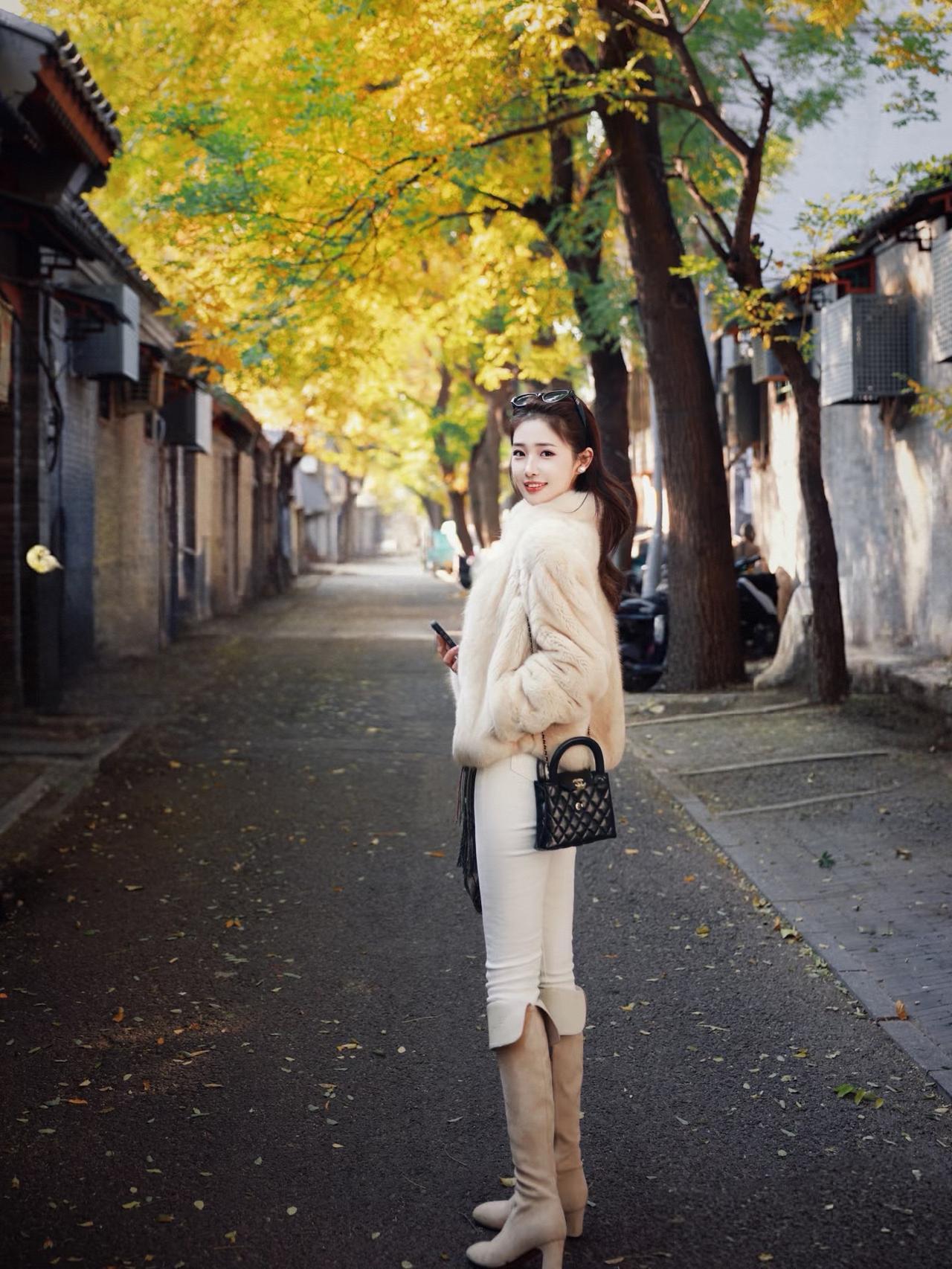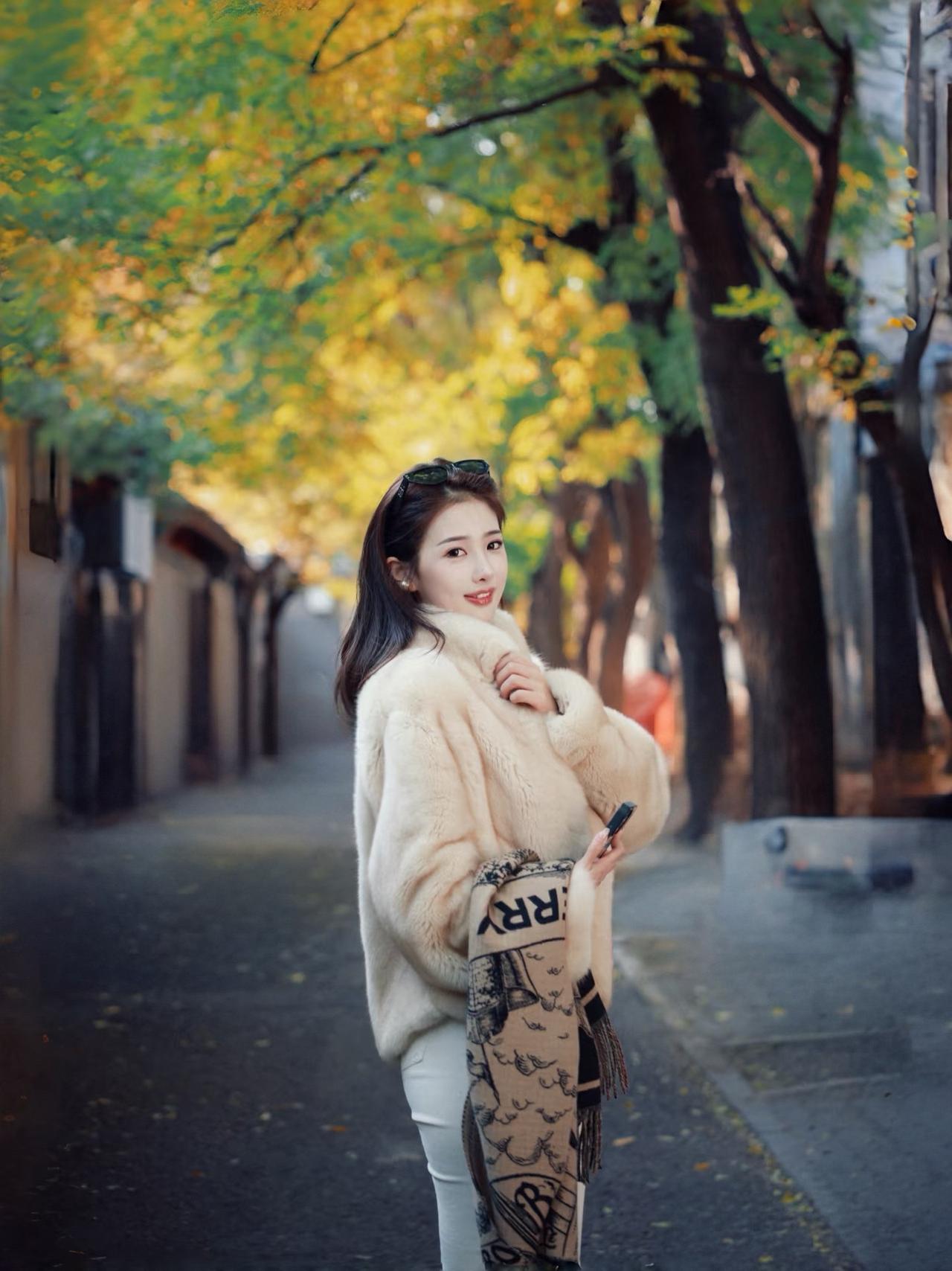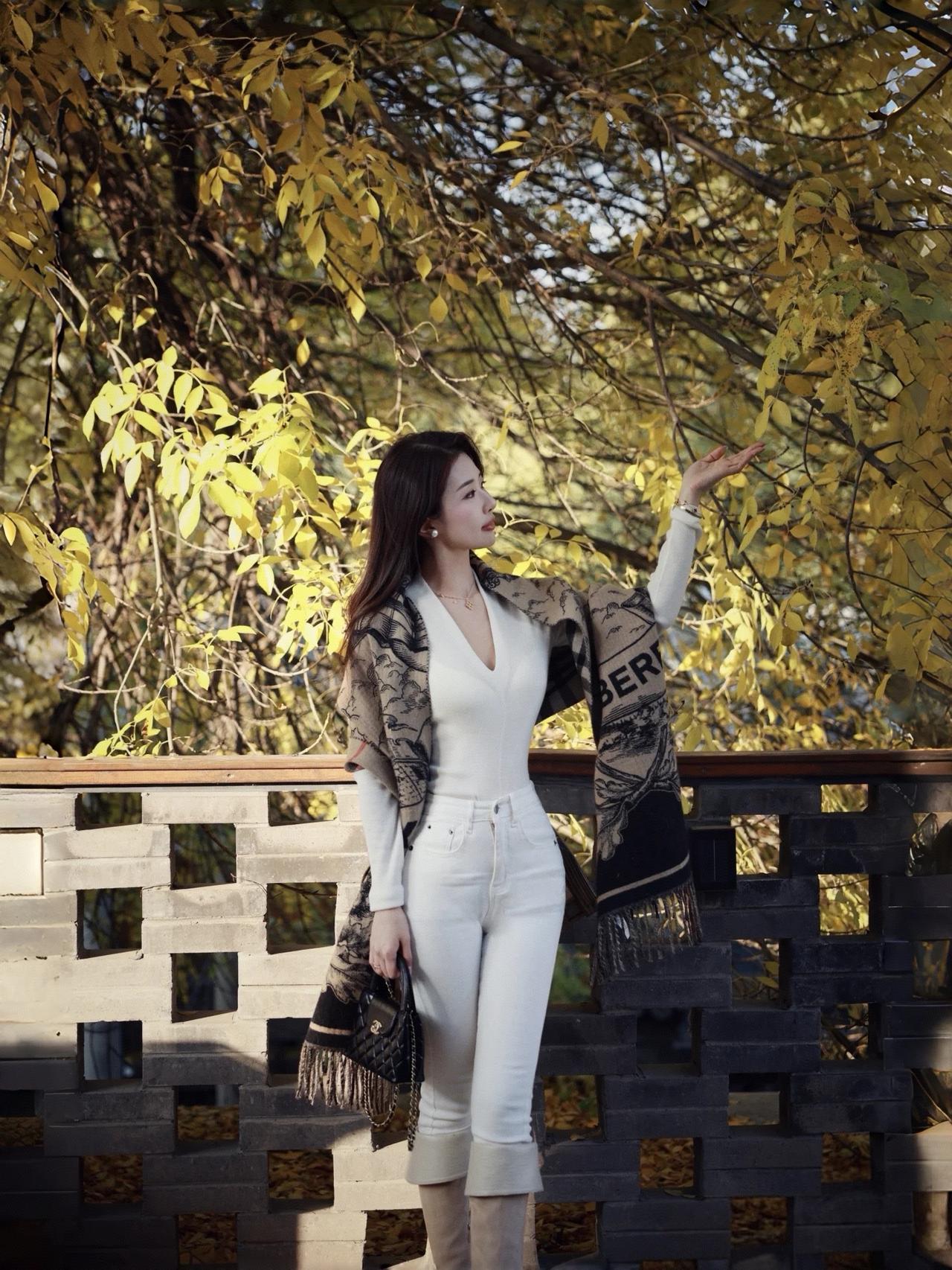 冬日暖阳下,白衣少女倚壁炉,静享温馨时光。