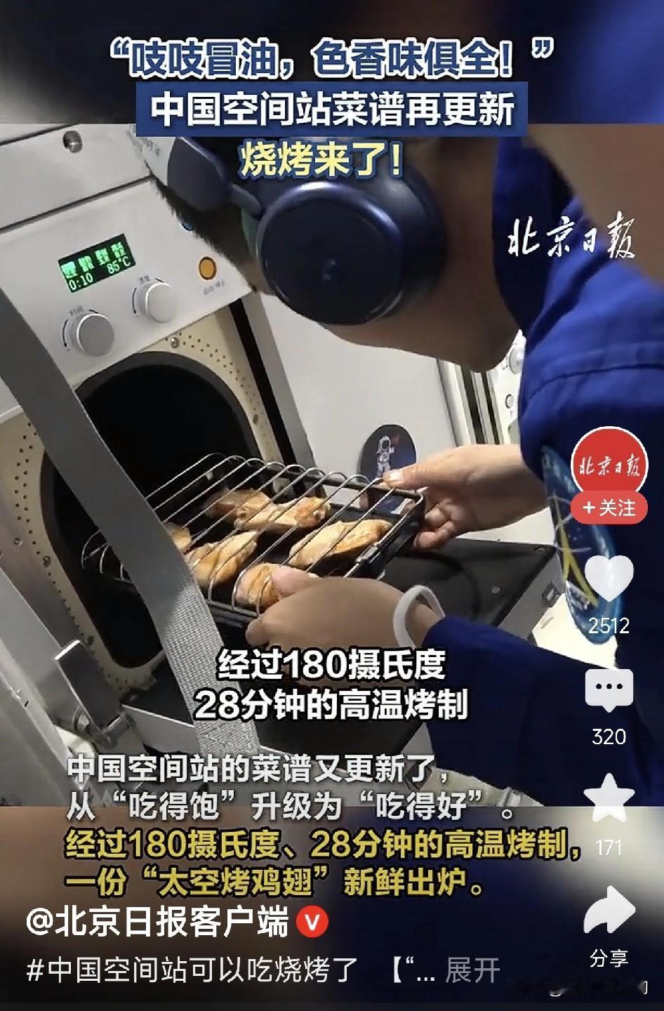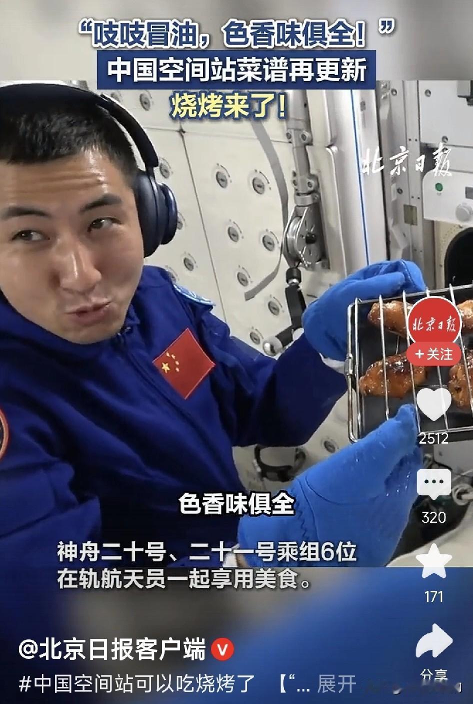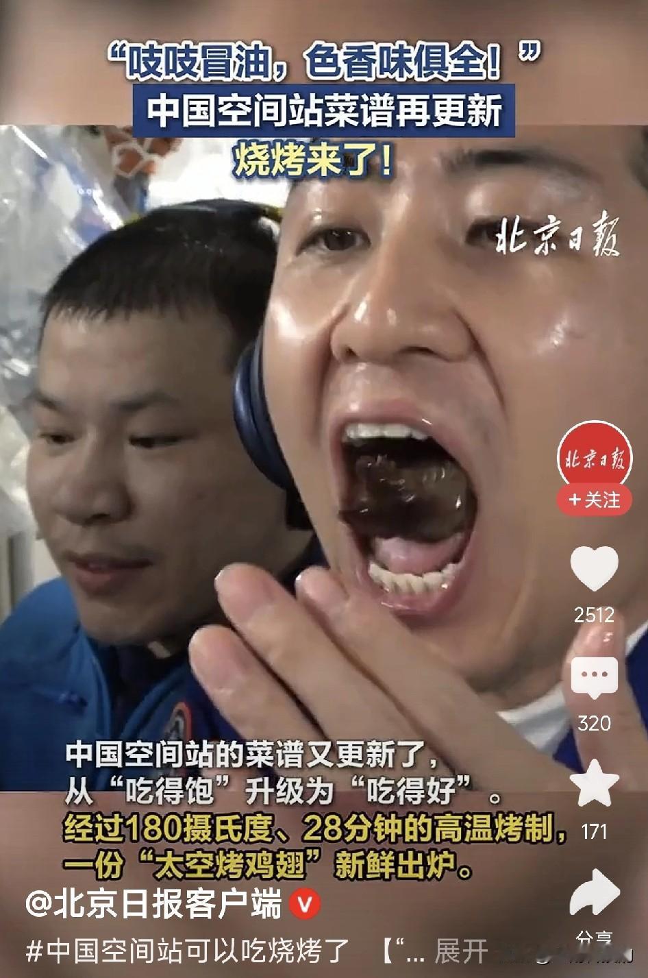 厉害了!中国宇航员都在太空撸串了,看得地球上的我流口水!这大概就是传说中的“香飘宇宙”吧? 从地面到太空,从家常便饭到科研级美食,咱们用实力证明了:吃货的想象力和创造力是无限的,而强大的国家,总能满足吃货的各种“奇思妙想”。看着航天员在太空里美滋滋地撸串,我既为他们感到开心,也为自己是中国人而自豪。 想想以前看太空题材的电影,宇航员吃的都是压缩饼干、营养液,干巴巴的没一点食欲。再看咱们的空间站,从热乎的宫保鸡丁、鱼香肉丝,到现在的太空烧烤,菜单越来越丰富,甚至还专门研究零重力环境下的烧肉味道,这背后是无数科研人员的努力,也是国家综合实力的体现。毕竟能在太空里“撸串”,可不是随便哪个国家都能做到的——得有稳定的空间站环境,得有先进的食品加工和储存技术,还得有懂吃货需求的科研团队,缺一不可! 这波太空撸串,不仅让全世界看到了中国人的浪漫和幽默,更让我们感受到了国家的强大。以前总觉得太空离我们很遥远,可当航天员在太空里吃着和我们日常相似的烤串,突然就觉得,太空探索也可以很生活化、很有温度。而且我相信,这只是开始,以后说不定还能在太空里吃到火锅、麻辣烫,甚至包饺子、包粽子,把中国美食彻底带向宇宙! 这是我们中国人最接地气的浪漫——科研不只是冷冰冰的实验数据,也可以是让航天员在遥远太空里尝到家乡味的温暖,更是咱们中国人“走到哪吃到哪”的硬核实力!(图片来源于网络,侵删)