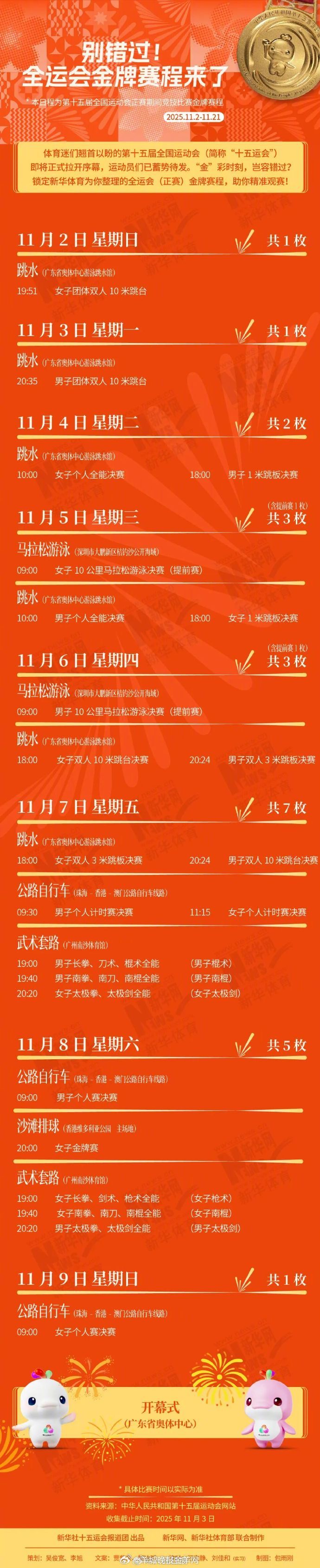【转需!#十五运会金牌赛程来了#】十五运会即将正式拉开序幕,运动员们已蓄势待发!收藏这份全运会(正赛)金牌赛程↓↓#全运会看点最全梳理##一起看全运会#! #十五运会精彩纷呈#