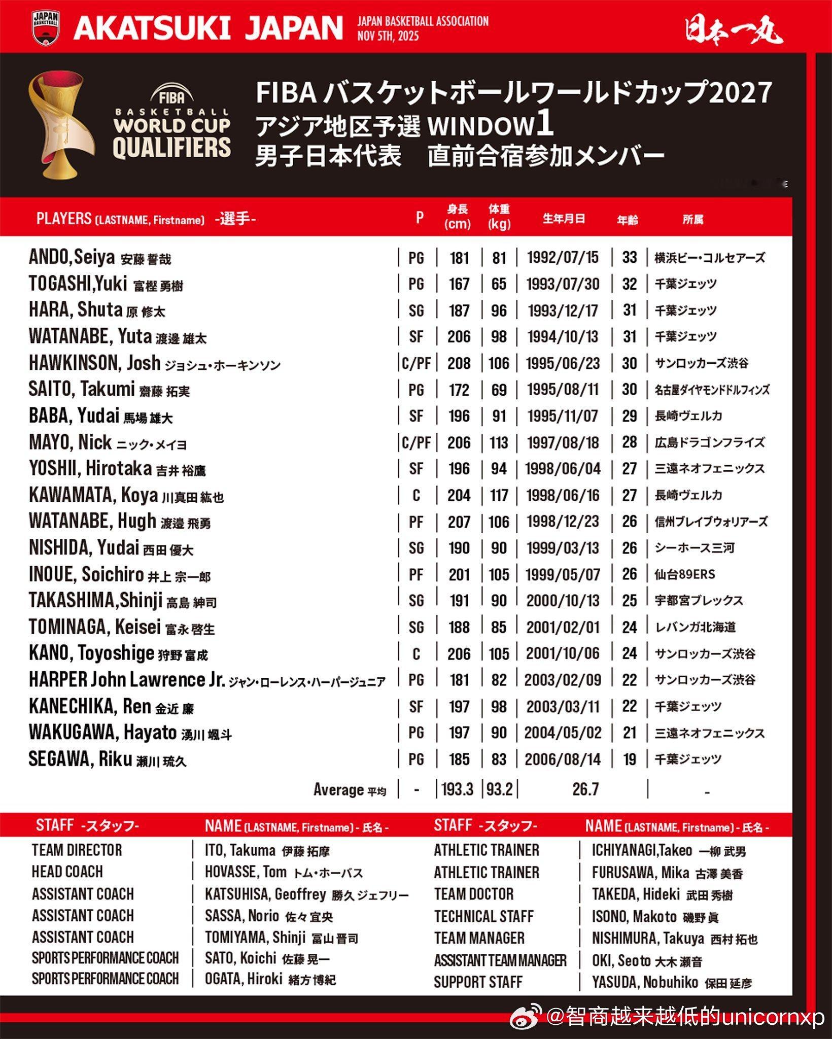 日本男篮宣布世界杯亚洲区预选赛20人集训名单,新归化Nick Mayo进入名单亚洲篮球