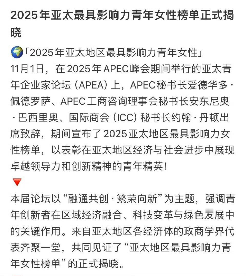 赵丽颖荣获「2025年亚太地区最具影响力青年女性」之一