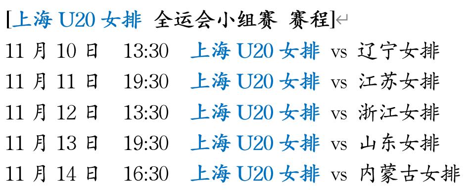 全运会|上海U20女排小组赛赛程 第十五届全运会上海女排小组赛赛程: 11月10日13:30上海-辽宁 11月11日19:30上海-江西 11月12日16:30上海-山东(李晨瑄,郭湘玲) 11月13日16:30上海-浙江(陈曦悦,季雨潇) 11月14日19:30上海-内蒙古 上海女排的小组赛赛程安排紧凑而具有挑战性,球队将连续五天迎战辽宁、江苏、浙江、山东和内蒙古等实力不俗的对手,其中对阵山东女排的比赛尤为关键。山东队拥有李晨瑄和郭湘玲,孙虹云,国炜琳,刘虹菲等一众青年国手,是夺冠的大热门。这场硬仗不仅将直接影响上海队的小组出线名次,也将成为检验球队应变能力与稳定性的关键节点。上海U16女排加油![给力]