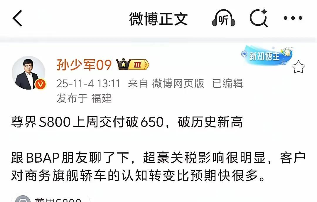 比亚迪的仰望和华为合作的尊界,目前来讲,算是国产最高端的豪华品牌了,两个品牌的销量也都创造了新高,尊界S800上周交付破650辆,算是一个新的记录,而仰望的销量也不差,10月整体销量也有600多辆。 虽说两个品牌目前的车型不一样,但都是国产品牌,主要的竞争对手还是传统的奔驰宝马奥迪保时捷,也明显感觉这些品牌的豪华车的销量在逐步下降,一方面是因为关税的原因,另外一方面也是因为国产的豪华品牌技术质量并不差,消费者已经开始转变观念了。 其实在我看来,仰望就是国产新能源技术的天花板,基本上所有的新技术可行性技术都在车辆上体现了,比如仰望U9X的30C充放电磷酸铁锂刀片电池,超高速电机,易四方技术,应急浮水技术,2.0T的水平对置发动机等都是目前的天花板。 换句话说,国产豪华品牌多卖一辆,国外的就少卖一辆,这才是真正大家所乐意看见的。