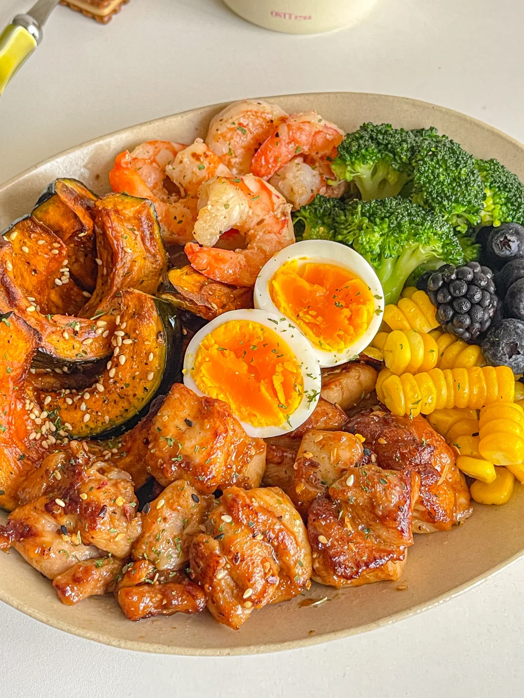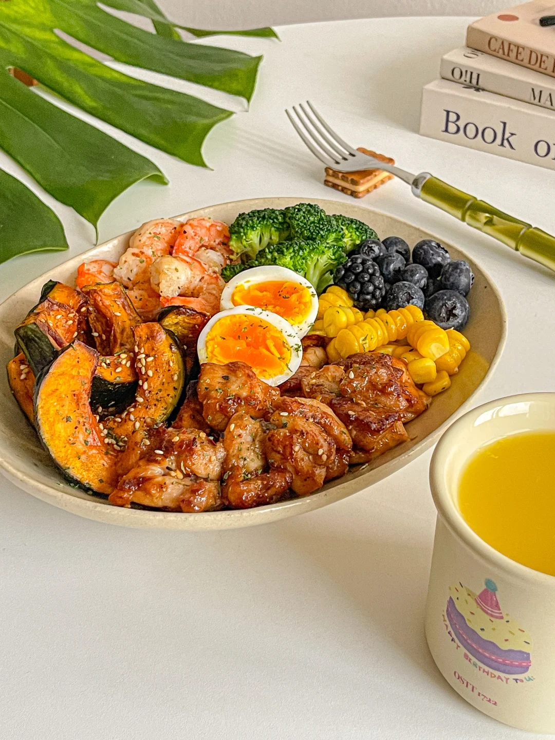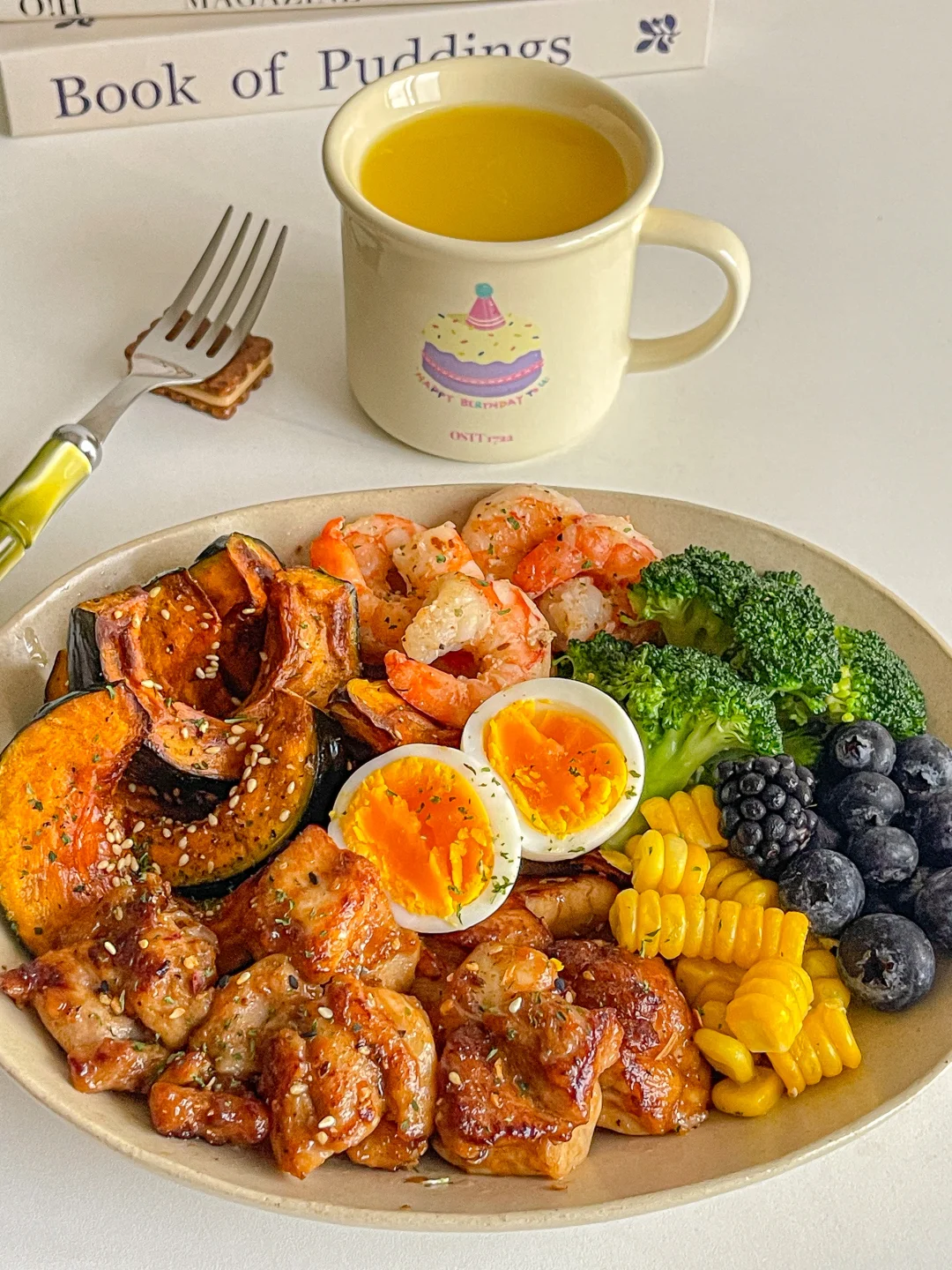 适合秋天的干净料理🍂 满满当当的一盘🍽️营养美味高蛋白‼️ 菜单:🍤 煎鸡腿肉➕煎虾仁➕烤贝贝南瓜➕溏心蛋➕西蓝花➕蓝莓➕玉米 秋天就爱吃烤的贝贝南瓜 [亲一个R] 外酥里糯 越吃越香 搭配虾仁和鸡腿肉满满高蛋白!蓝莓也不能少 富含花青素 西蓝花营养均衡💯咖啡豆断货了 今天喝橙汁凑合一下[喝奶茶R]