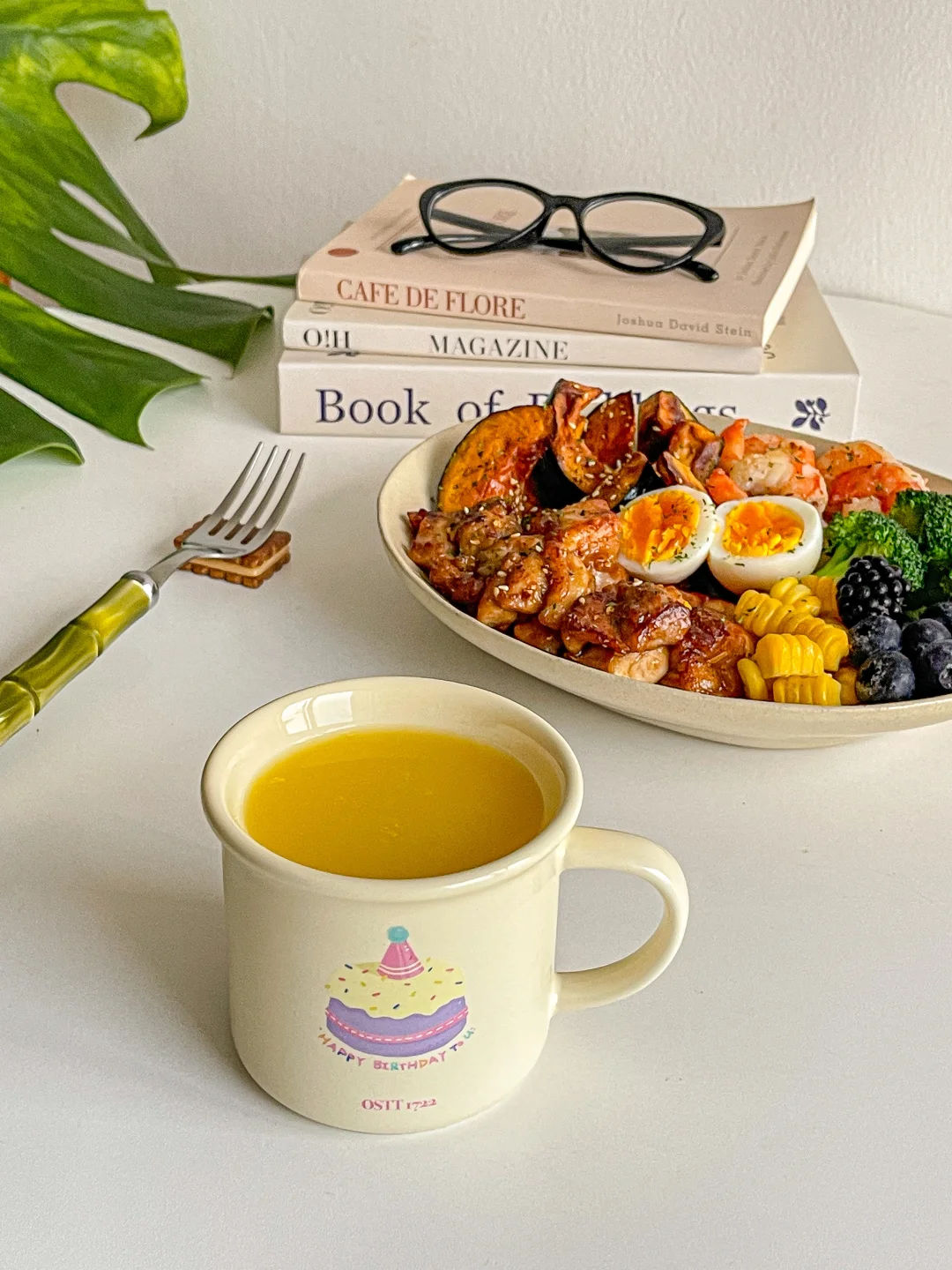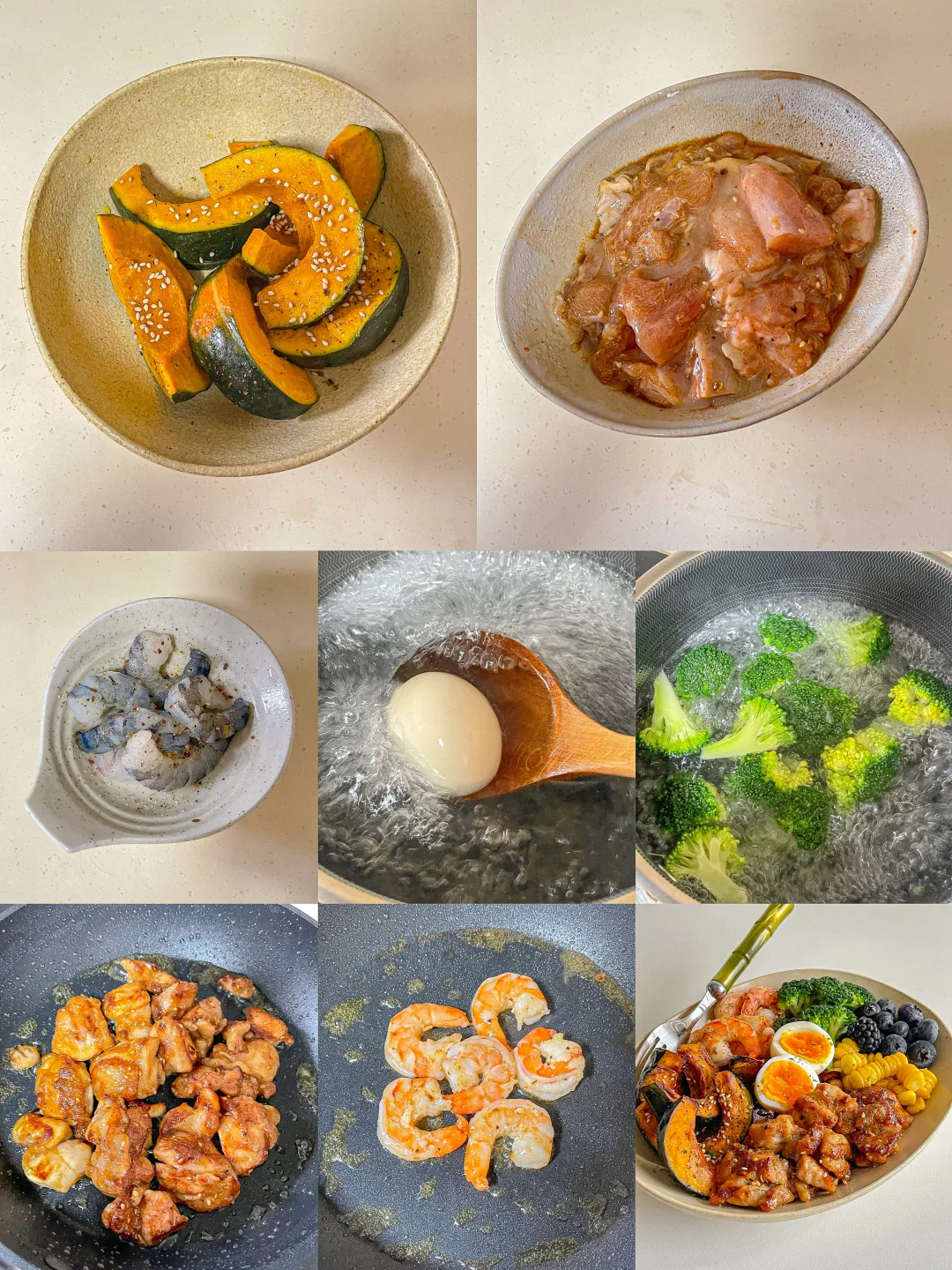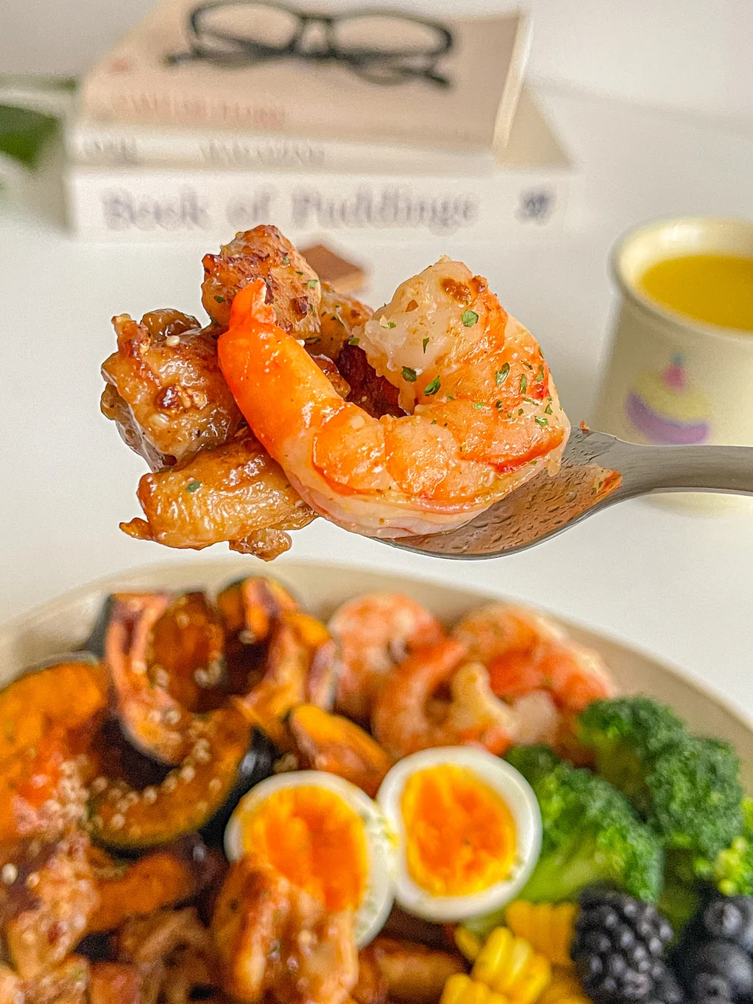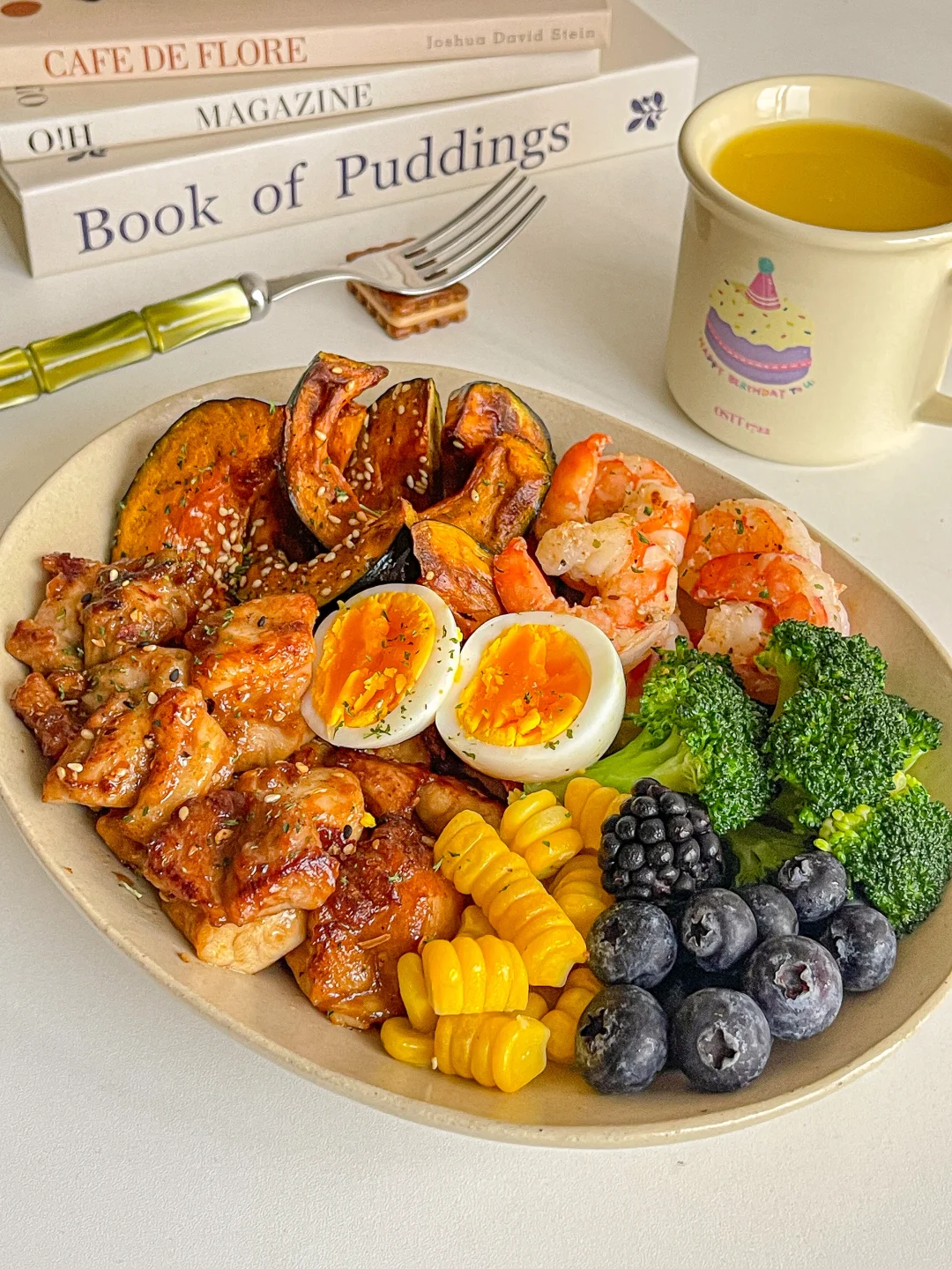 适合秋天的干净料理🍂 满满当当的一盘🍽️营养美味高蛋白‼️ 菜单:🍤 煎鸡腿肉➕煎虾仁➕烤贝贝南瓜➕溏心蛋➕西蓝花➕蓝莓➕玉米 秋天就爱吃烤的贝贝南瓜 [亲一个R] 外酥里糯 越吃越香 搭配虾仁和鸡腿肉满满高蛋白!蓝莓也不能少 富含花青素 西蓝花营养均衡💯咖啡豆断货了 今天喝橙汁凑合一下[喝奶茶R]