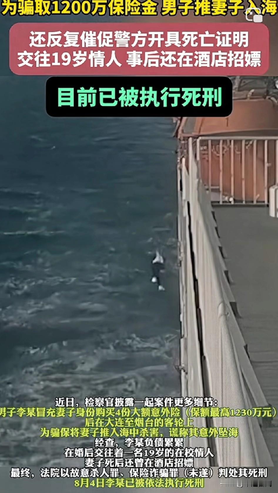 辽宁一男子为骗保推妻子入海,已被执行死刑 !检察官披露案件细节 ! 已婚交往19岁在校情人,事后酒店嫖娼,为了他奢侈糜烂的生活害人害己。 看过原视频,给我看哭了,那个男的骗他老婆,说去护栏上拍照,她还傻傻的开心的跳来跳去,结果被她老公推下海了,好可怜😭!