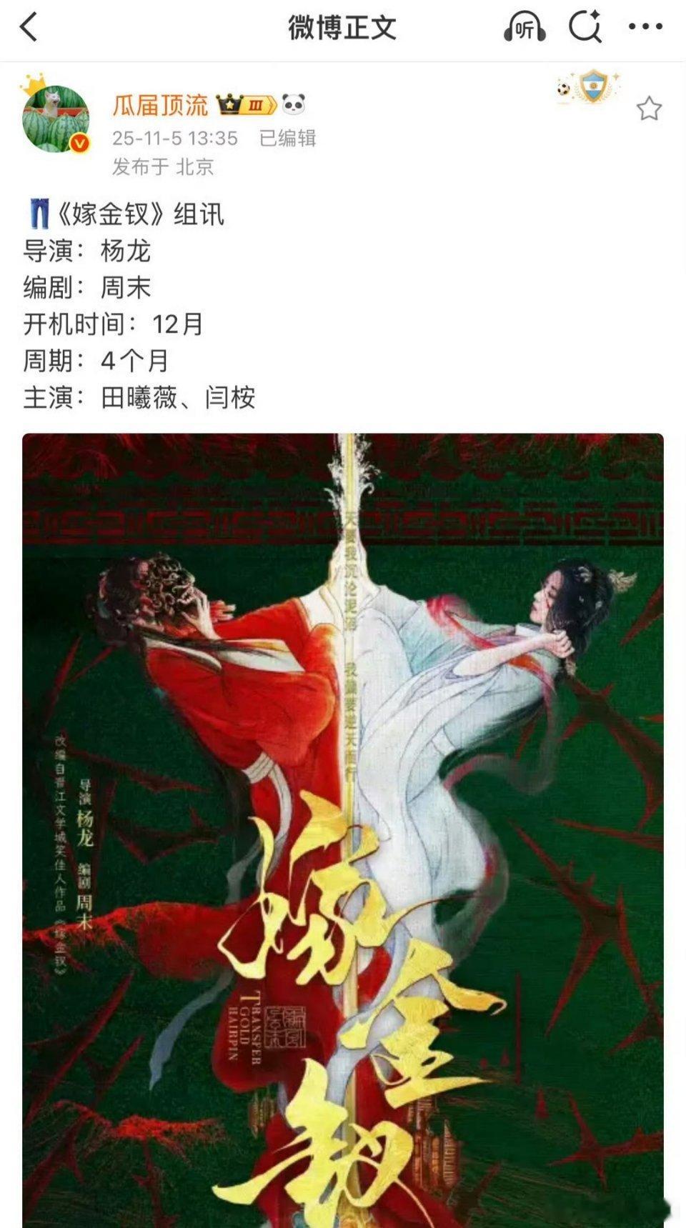 🍉《嫁金钗》主演:田曦薇闫桉哇哦,这个搭配蛮新鲜噢[鼓掌][鼓掌]!