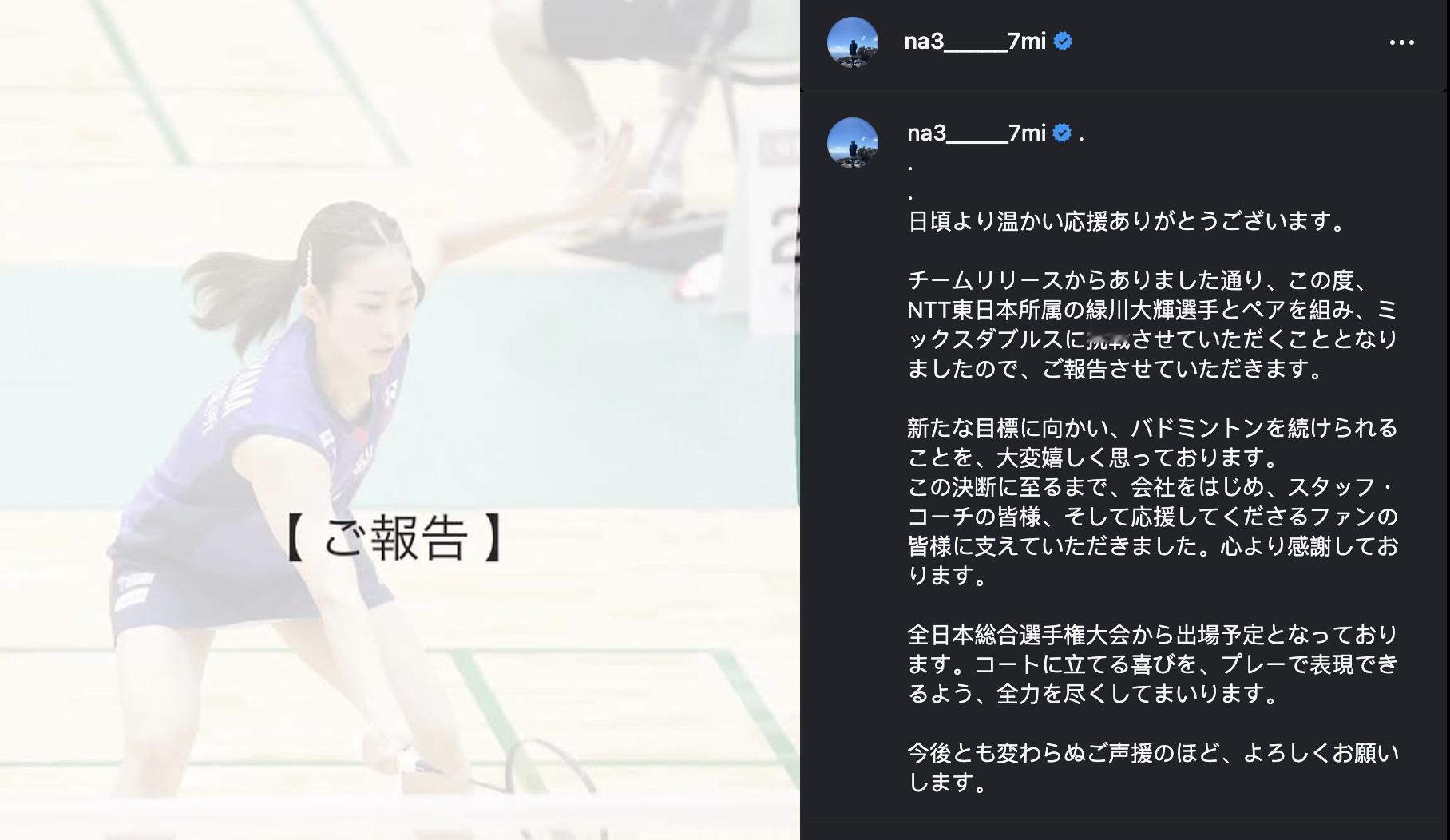 正如团队官方发布的信息,在此向大家报告,我已决定与隶属于NTT东日本的绿川大辉选手组成搭档,共同挑战混合双打项目。
