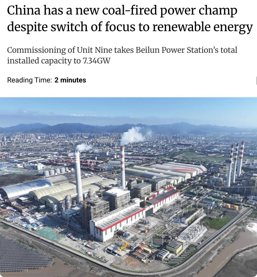 外媒:中国浙江宁波的北仑电厂在新增一台1吉瓦的燃煤发电机组后,成为中国国内装机容