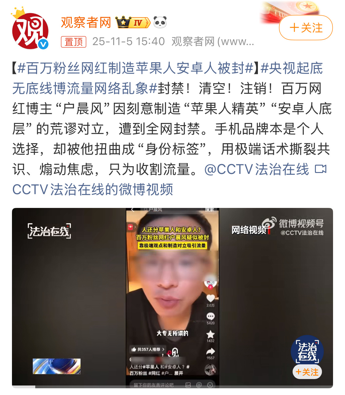 百万粉丝网红制造苹果人安卓人被封观点太极端了,关键是还有一群人表示认同,那问题就很大了。不知道这次是不是永封[吃瓜]