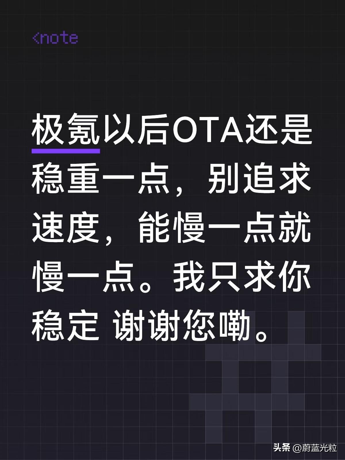 极氪以后OTA还是稳重一点,别追求速度,能慢一点就慢一点。我只求你稳定谢谢您嘞