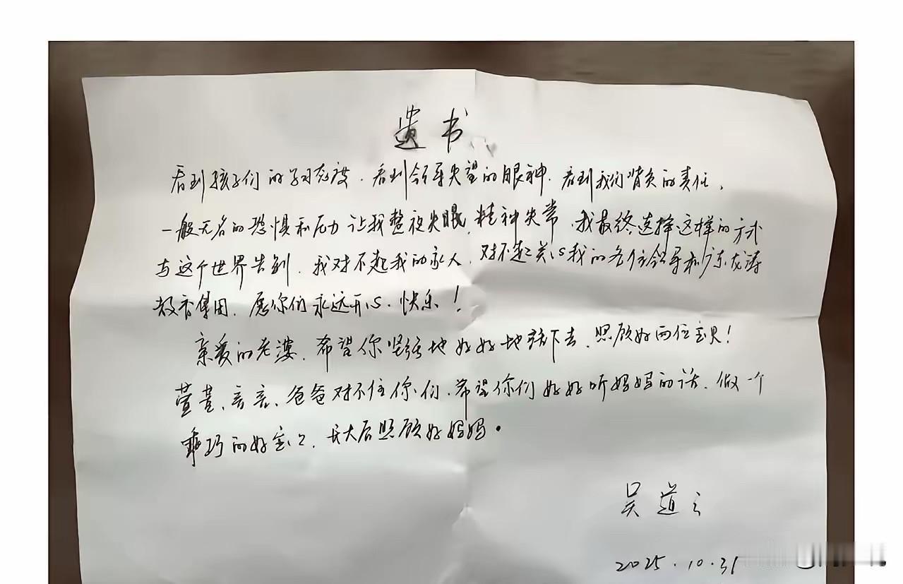 真的让人痛心!网传广东一老师,因难以承受来自学校领导与学生家长的双重压力,过度焦虑致精神失常,最终无奈留下遗书。 看完这位老师的遗书,周少不得不说真的太心疼了,老师不光要教书,还要应对各种琐事压力,特别是一线教师的心理健康也该被重视。 这起事件也敲响了警钟,教师的心理健康是校园稳定的重要基石。我们既关注学生的身心成长,也不能忽视教师群体的压力困境。 学校应建立合理的压力疏导机制,社会也需给予教师更多包容与支持,让他们能在安心的环境中教书育人。#寻美三湘# #长沙新朋友#
