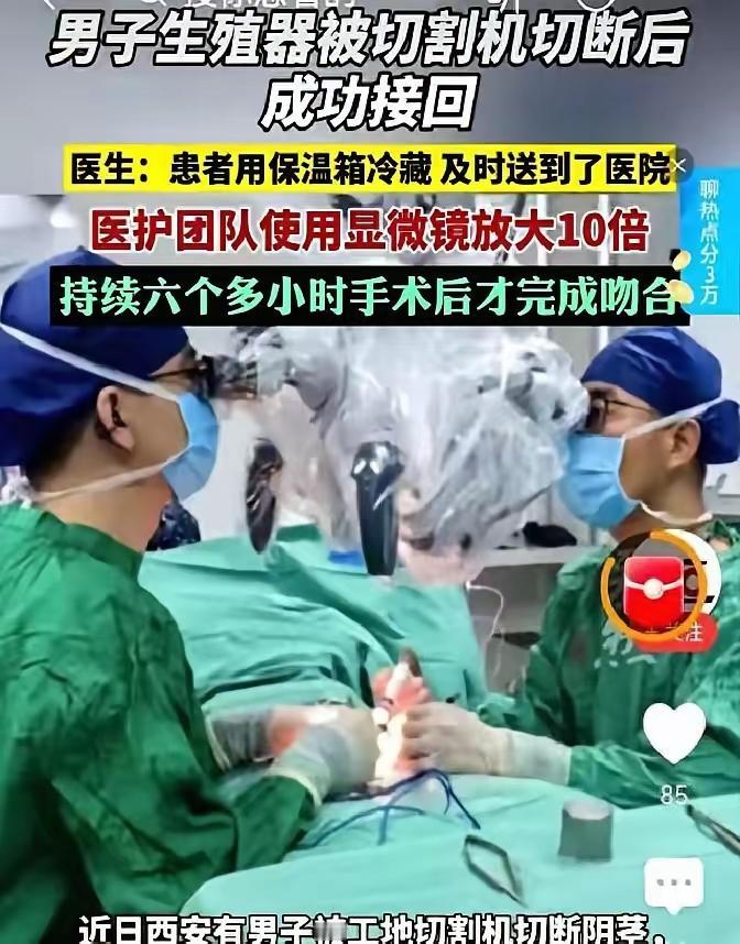 遇事要冷静,不要慌。42岁钢筋工命根子不慎被切断,妻子妥善处理,安然无恙,术后第3周小便顺利排出,恢复了正常功能 男人工地上干活,有不少风险。这不,42岁的钢筋工一分心,好巧不巧,生殖器竟然被切机给削掉了半截!鲜血淋漓,给他打下手的妻子吓的面无血色。救人要紧。妻子怕是怕,但没有慌张,没有手无足措。妻子扯块干净布先按住伤口止血,让人赶紧打120求医。她把割下的男人的命根子搁进装了冰块的矿泉水瓶里,再塞进保温盒密封好。和男人一起送进了医院。医生使用显微镜放大十倍,经过长达6个小时的显微镜手术。妙手回春,男人的生殖器成功接回。真是惊心动魄啊!一方面是医生的医术高,另一方面与妻子正确的急救方法分不开。男人的伤害恢复如初,这个家庭又开启了幸福生活模式,挺好的!