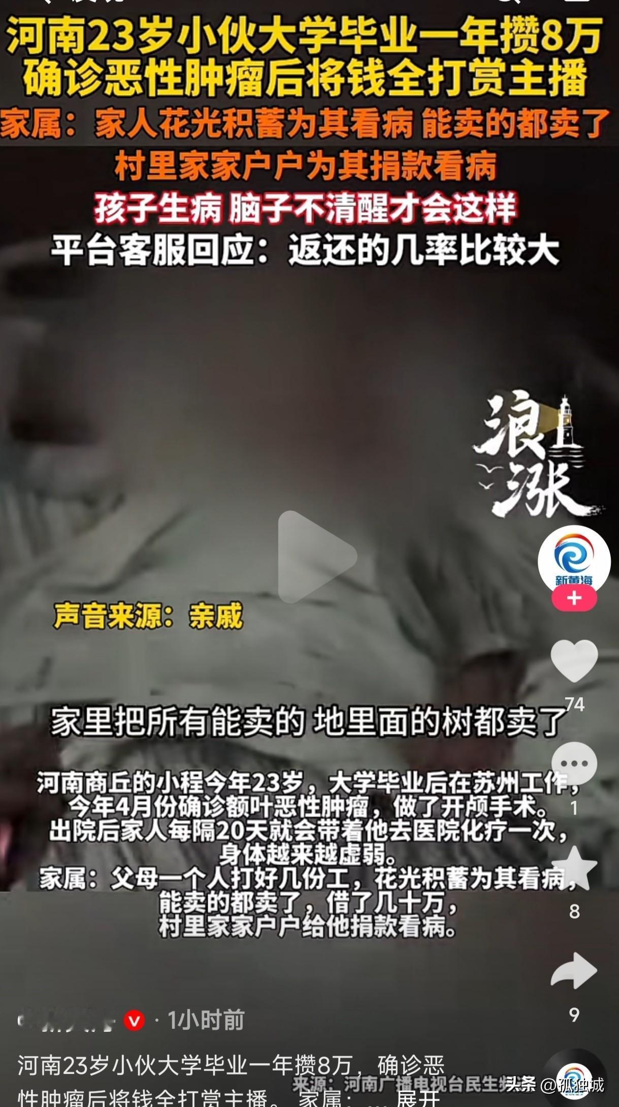河南23岁小伙大学毕业一年攒8万,确诊恶性肿瘤后将钱全部打赏主播,只因做了开颅手术脑子不清醒才导致把钱全部打赏了主播。 父母每人打好几份工,花光积蓄为他看病,家里能卖的都卖了,而且还借了几十万,村里家家户户都给他捐款看病,他却因为做了开颅手术脑子不清醒,把所有的钱都打赏了游戏主播,父母知道此事后,也联系了平台客服,平台客服回复的说法是,打赏的钱返还的几率比较大。 这恶性肿瘤开颅后居然脑子不正常了,这可真是件愁人的事,23岁的青春少年,本以为毕业后能有所成就,没想到天不遂人愿,如此大的苦难降临在了他身上,希望平台能返还他打赏的救命钱,也祝愿他早日康复,回归到正常的生活中。