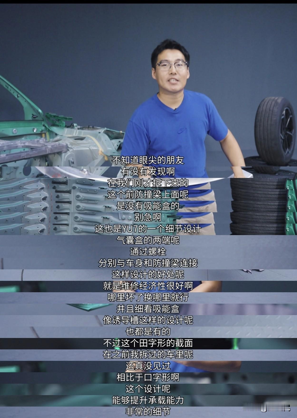 小米YU7全网首拆: 和很多热门车型一样,小米YU7也迎来他的全网首拆,11月5日,易车发布了小米YU7全网首拆视频。整整30分钟的视频,把小米汽车上下里外扒了个底朝天,连雷军都认真看完。 有一说一,判断一辆车最终极的方法就是拆车,而且是那种彻底拆到白车身那种。 虽然车的终极目的是驾驶,但驾驶的基本底线是安全,上限是体验,比如智能化、舒适度等。 看了这条拆车视频发现,小米汽车的用料还是很扎实的,比如被动安全、电池安全防护、NVH、驾控等,很舍得下成本。 在车圈流行一句话,看不见的地方,要用良心去做。一辆车有太多太多贵重的车身、核心零部件,是看不见的。 比如前防撞梁、超强钢,薄点厚点,多点少点,用什么材料,大多数车主是不太懂的,考验的就是车企的良心。 还有新能源汽车的电池防护,也很关键,小米YU7加了四根横梁,和14层电池防护,甚至还有防弹涂层,和电芯倒。 包括外部车漆、内部气密性、工整度等。 造车是一件长期主义事业,眼下任何的成功技术,拉长到百年汽车发展史来看,都微不足道。 目前来看,小米汽车已经做好了百年车企的前期准备。
