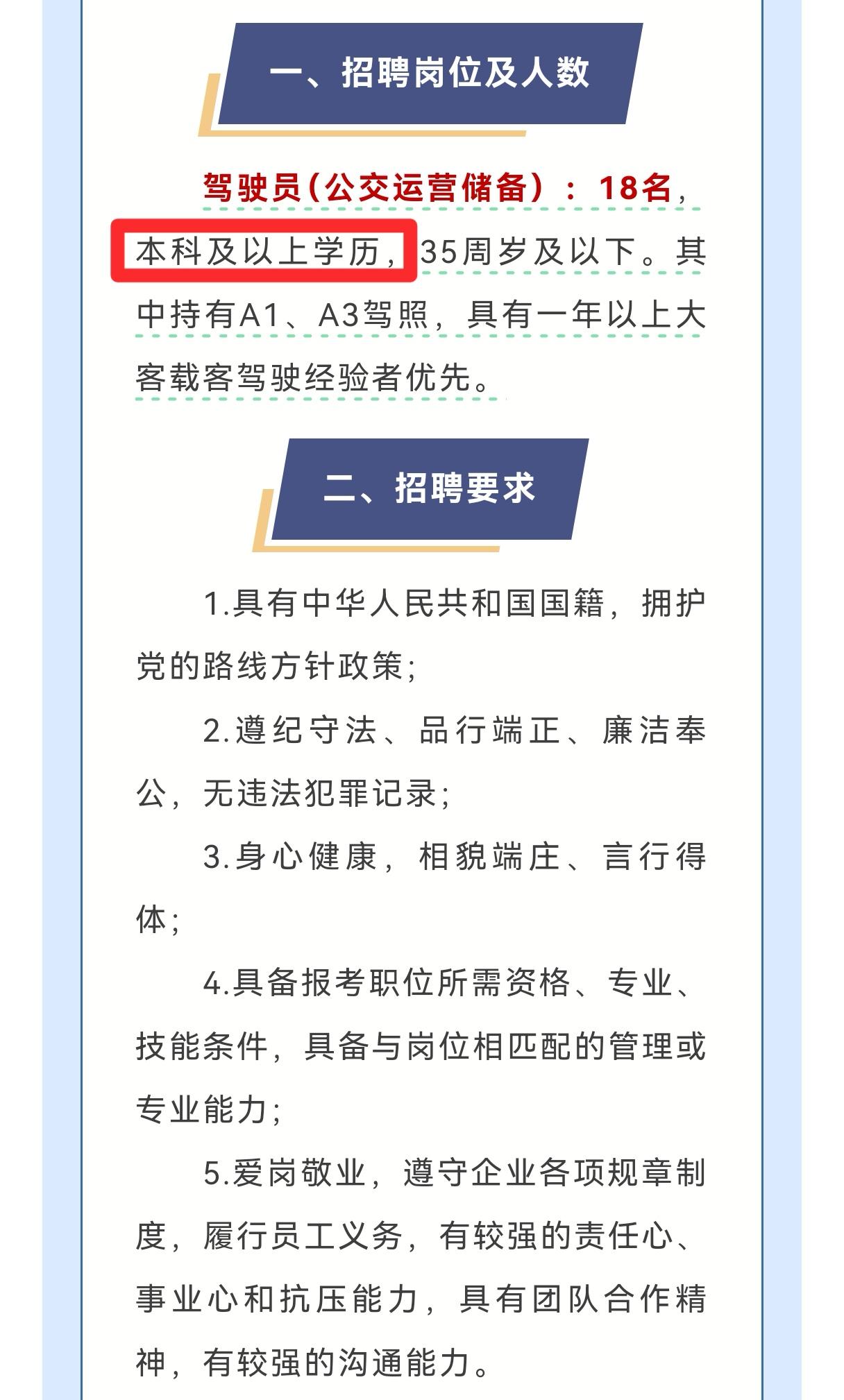 最近,苏州公交集团招聘18名公交运营驾驶员,要求应聘者学历为本科及以上,年龄在35周岁以下。 此要求一经公布,便有人质疑:开公交竟需本科学历,是否有些夸张?然而换个视角看,本科人才知识储备深厚,学习能力出众,或许能更妥善地应对复杂路况与突发状况。此前便有会英语的公交司机,能为外国乘客指引路线,本科司机说不定也能在服务方面推陈出新。不过,也有人担忧这是否会造成人才浪费,期望公交公司能让这些高学历司机充分施展才能。