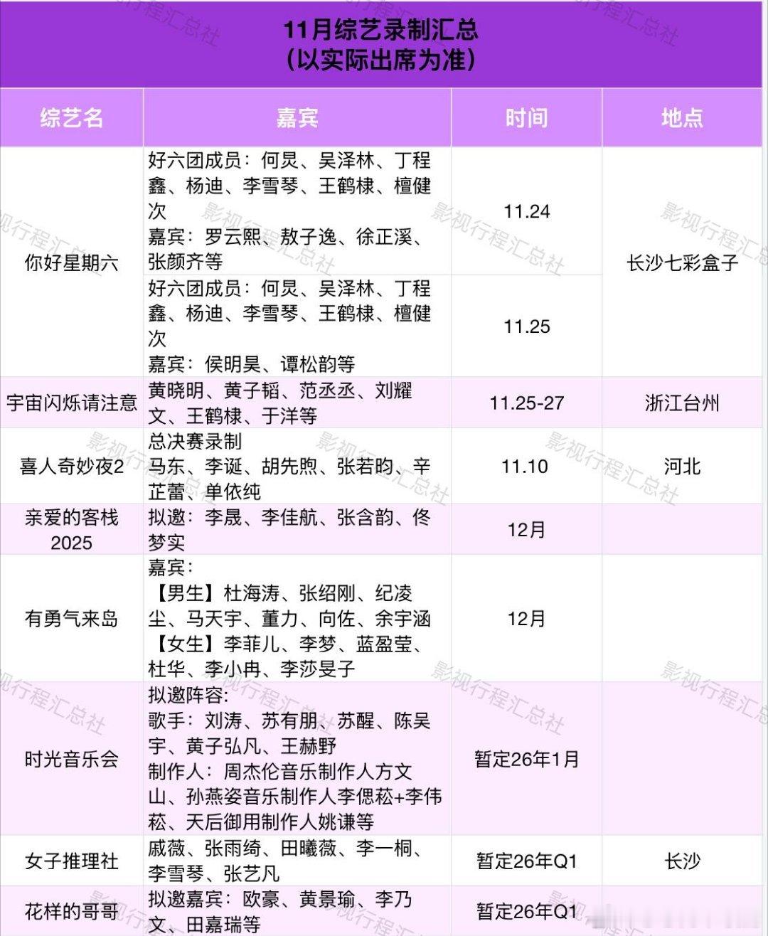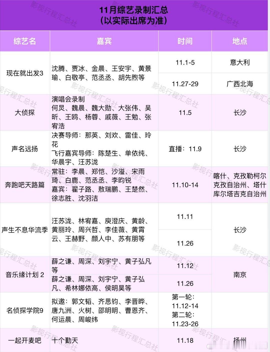 11月综艺录制汇总(以实际出席为准)