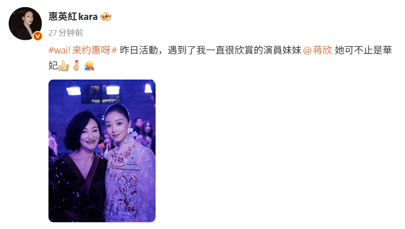 惠英红晒与蒋欣合照 5日,发博晒与的合照:“昨日活动,遇到了我一直很欣赏的演员妹妹,她可不止是华妃[good][手指比心][来抱抱]”。[期待]
