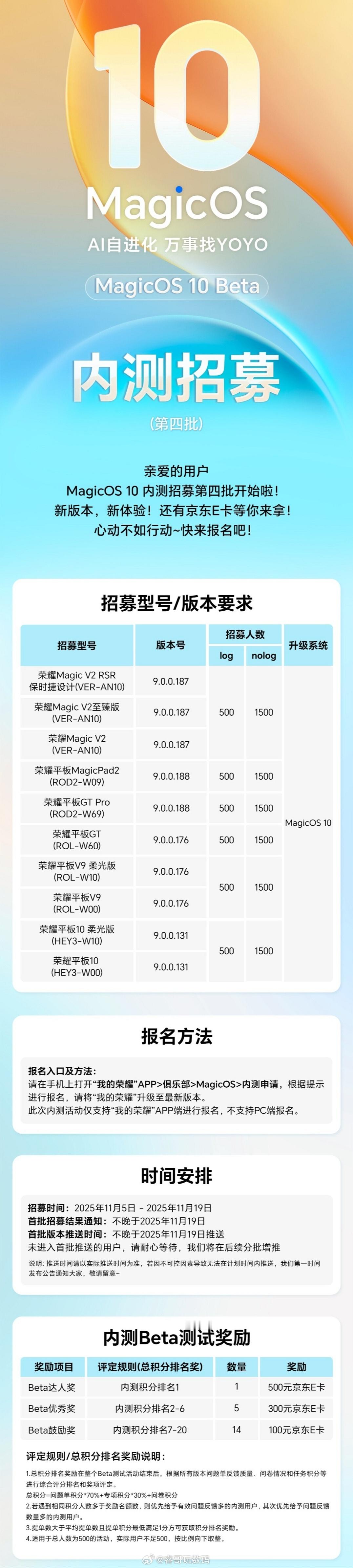 荣耀MagicOS10 内测招募第四批启动,本期招募荣耀Magic V2系列、荣耀平板MagicPad2、荣耀平板GT Pro、荣耀平板GT、荣耀平板V9系列、荣耀平板10系列,正在使用这些产品的朋友欢迎报名尝鲜体验!