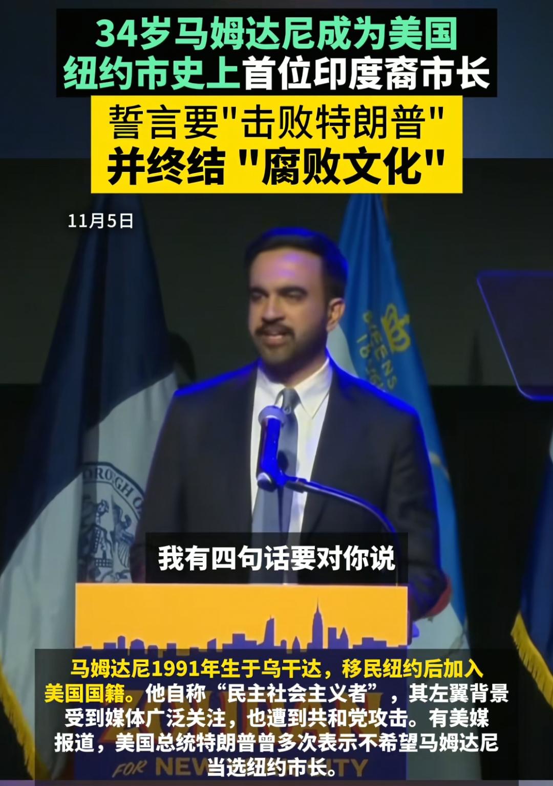 Buff叠满!出生在乌干达具有左翼背景的印度裔美国人马姆达尼成功当选纽约市市长! 他今年只有34岁,他当选成为美国纽约历史上最年轻的市长,看起来还是十分有能力的,关键他的支持率还相当的高。 此前已经有印度裔的人成功当上了英国首相,那么能不能有印度裔的人能成功当上美国总统呢? 各位是怎么看的?欢迎评论区留言。