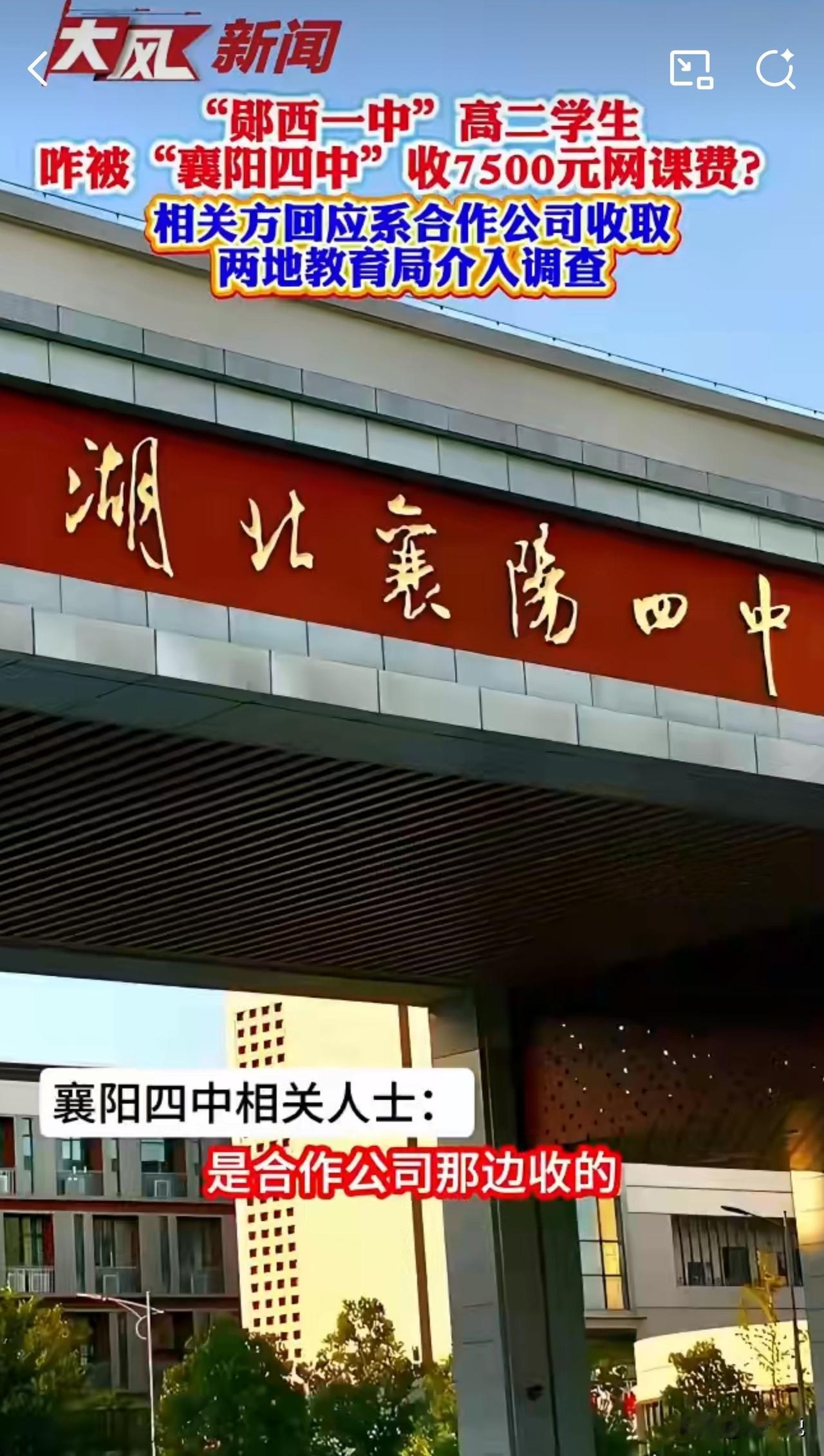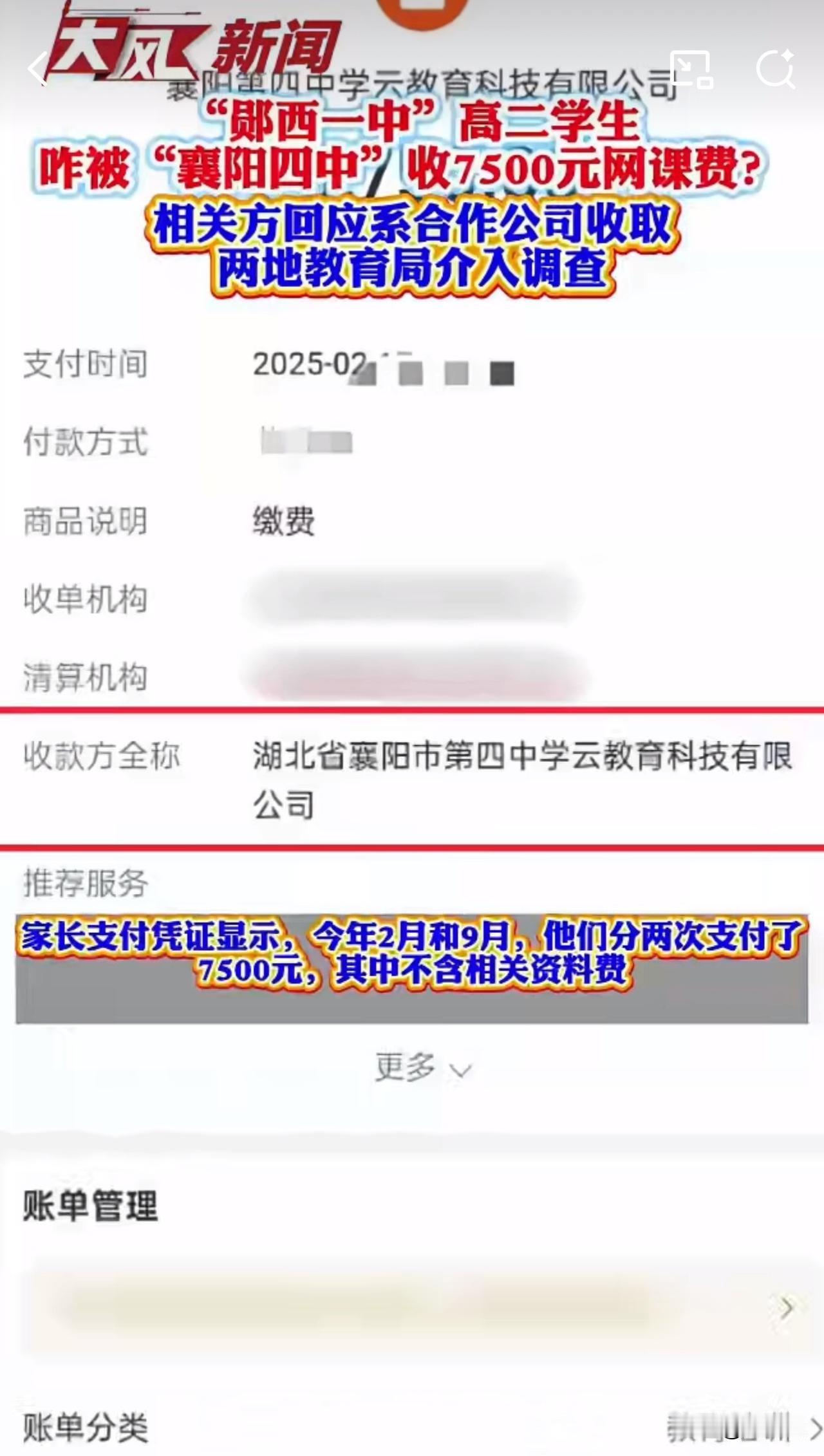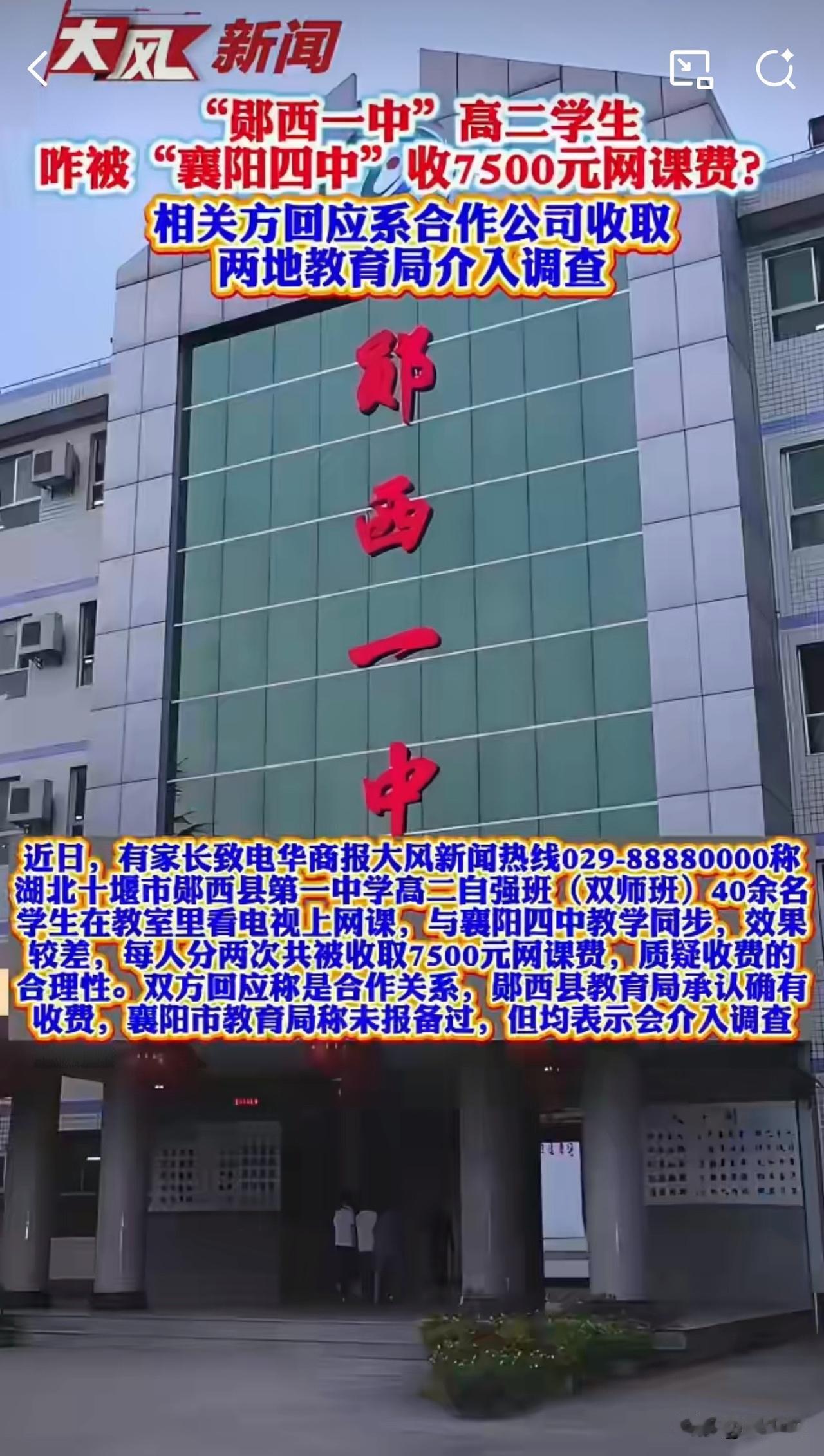 高二家长曝被强收7500元网课费!教育局介入调查,网友吵翻了! 湖北十堰郧西一中多名高二家长反映,孩子所在的双师班被强制收取7500元网络授课费,这对普通打工家庭来说压力不小。 家长称,“该班级同步襄阳四中的网课,学生只能看视频无法互动,效果不佳,校内老师有时还会补充授课。费用分两次收取,今年已支付部分款项,收款方为襄阳四中关联的云教育科技公司。” 记者联系学校及两地教育局,校方称是联合教学,是合作方收的,具体情况不详;教育局表示会记录反馈,襄阳教育局则称学校未报备该收费,公司收费不在其管辖范围。 就此网友热议不断。有网友说:“普通家庭一年多花七千多太离谱,效果不好还强制收”! 还有网友则认为:“校企合作收费得透明合规,不能让家长买单”! 更还有网友表示:“希望尽快查清是否存在违规收费,给家长一个说法”。 周少想说在教育收费问题上,透明与合规是底线。这笔高额网课费既未让学生受益,又加重家庭负担,还存在权责不清的问题。 期待监管部门深入调查,厘清责任主体,规范教育收费行为,切实维护学生和家长的合法权益,让教育回归公益本质。#寻美三湘# #长沙新朋友#