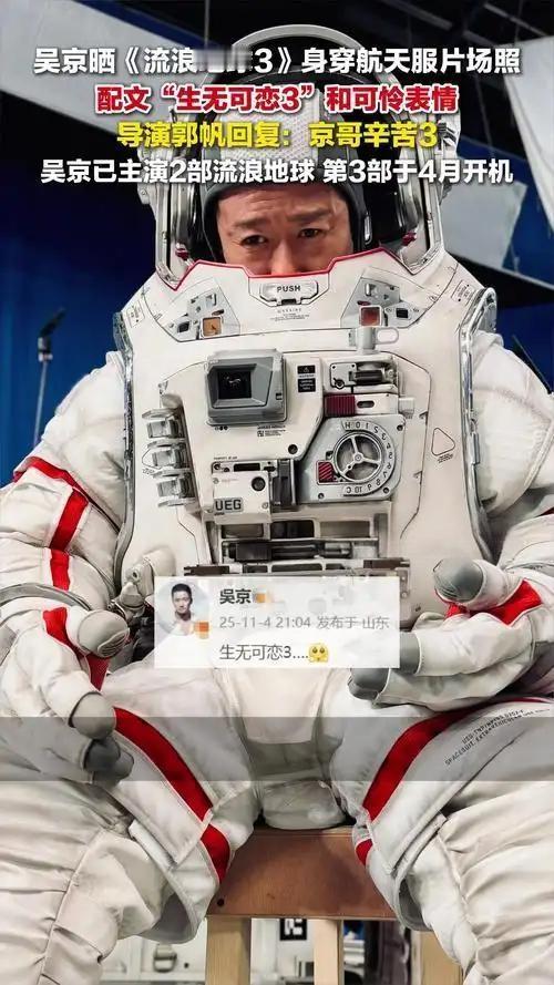 吴京晒《流浪地球3》片场照, “生无可恋3”引爆期待! 吴京刚刚在社交平台晒出《流浪地球3》片场照,配文“生无可恋3”,瞬间点燃影迷热情!照片中他一脸疲惫,让网友纷纷调侃:“京哥又被郭帆导演‘虐’惨了!” 从《流浪地球》的太空悬浮,到《流浪地球2》的数字生命计划,吴京在每一部中都挑战着生理极限。这“生无可恋3.0”版本,无疑暗示着第三部的拍摄强度再度升级,场面必将更加震撼。 作为中国科幻电影的里程碑,《流浪地球》系列承载着无数观众的期待。继第二部豪取40亿票房后,第三部早已成为下一春节档的预定爆款。吴京这波“接地气”的剧透,不仅拉近了与观众的距离,更为新作赚足眼球。 看来,为了“小破球”再次启航,京哥真是拼了!期待《流浪地球3》早日上映,再创辉煌!