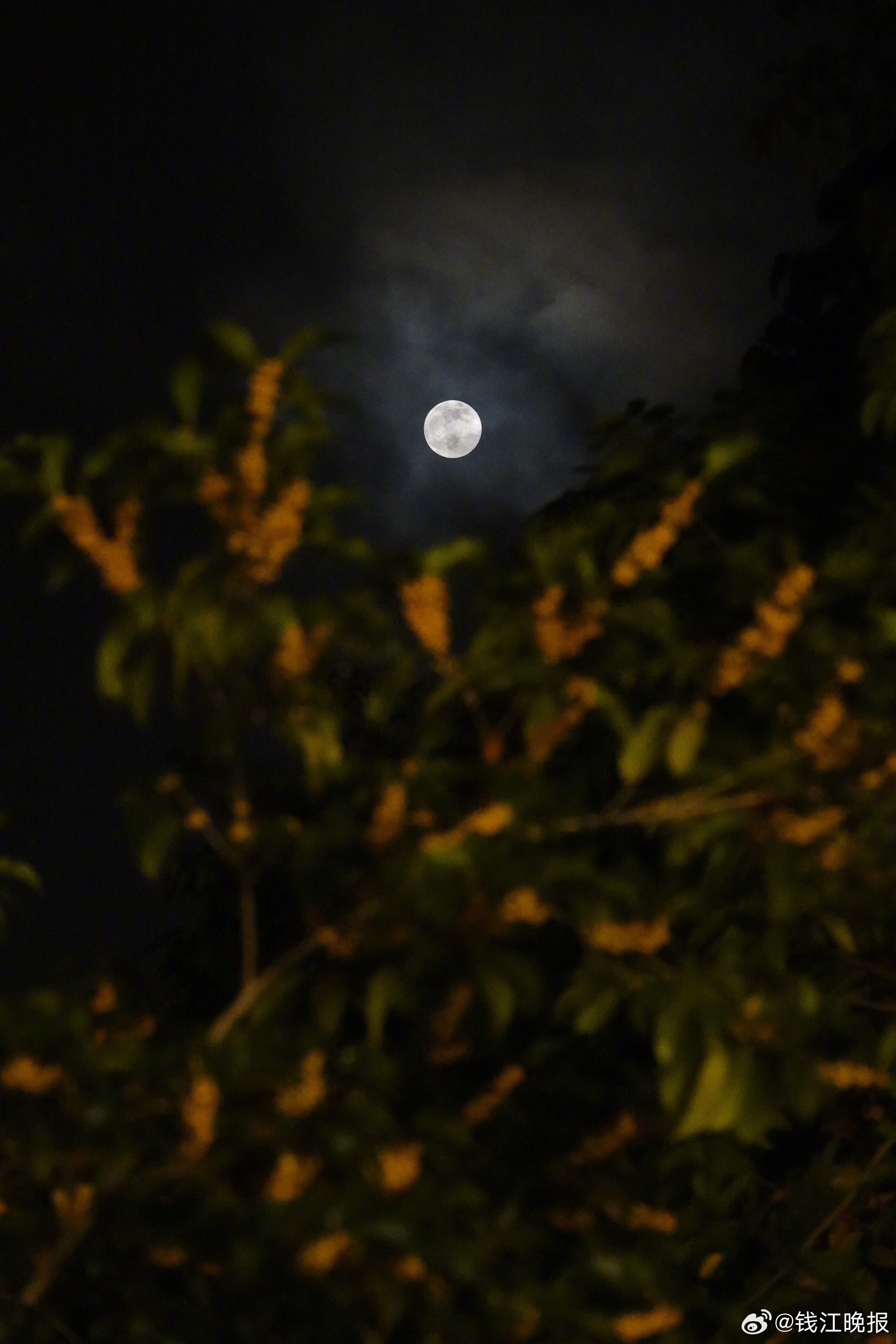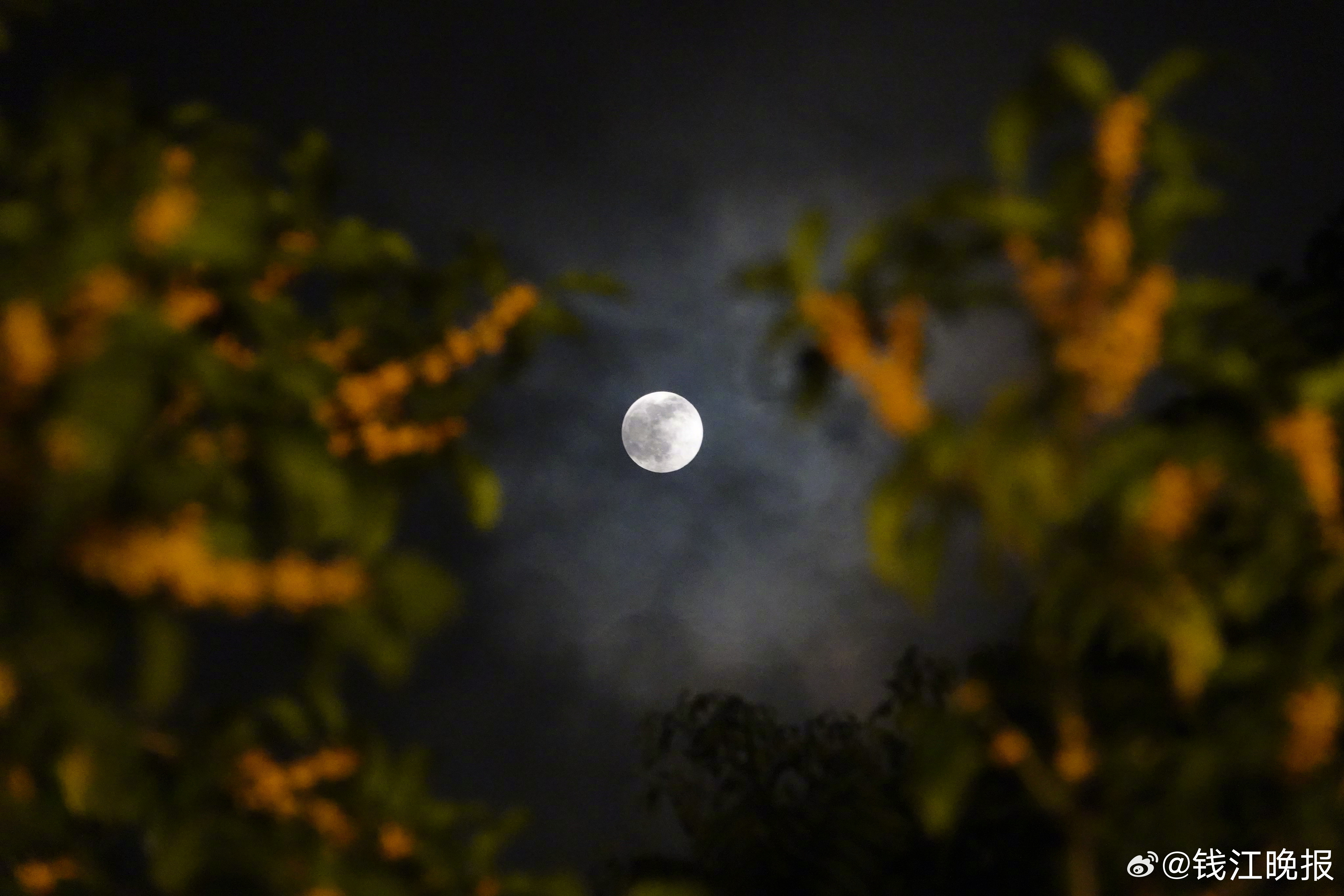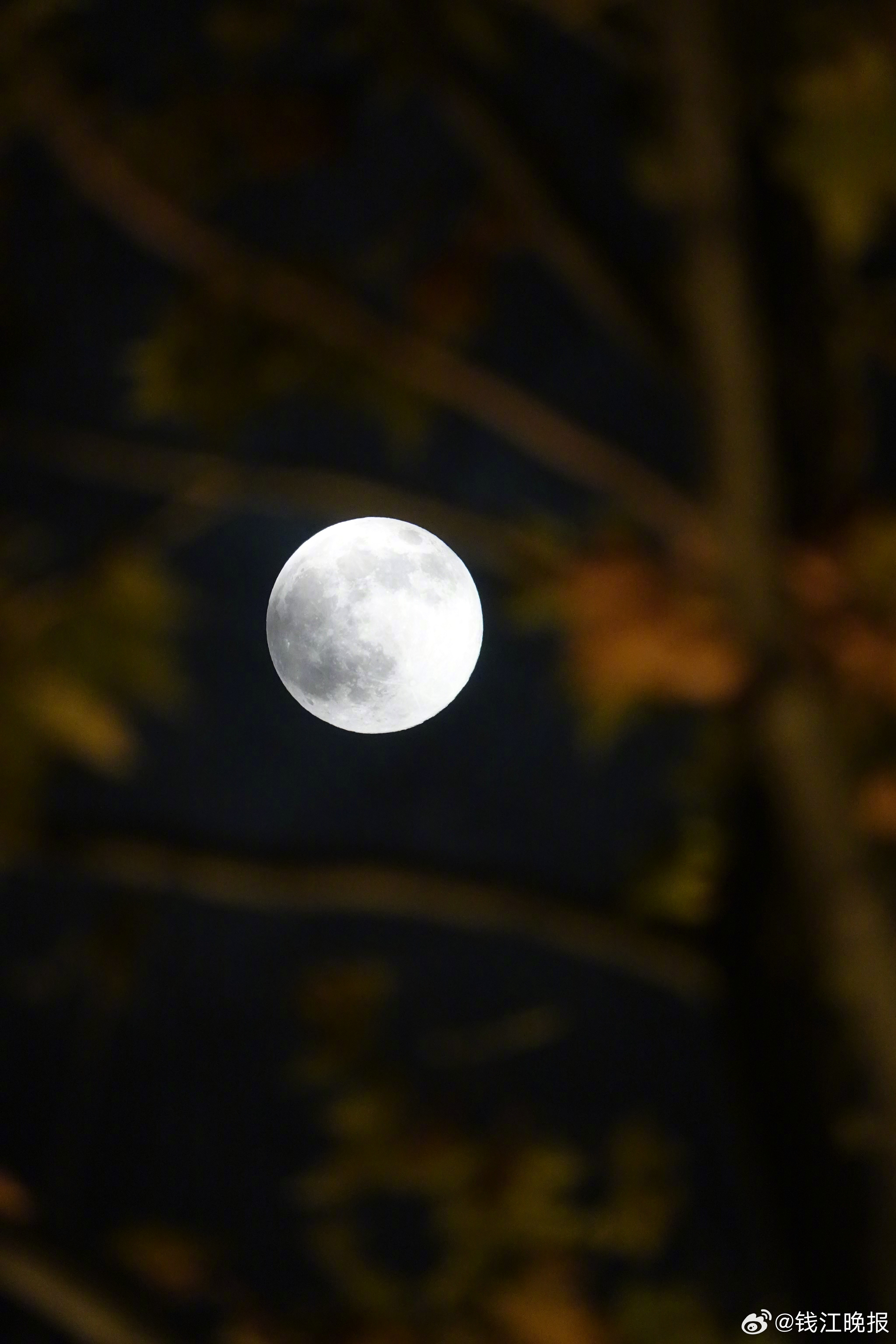 #杭州西湖边现超级月亮#【“超级月亮”霸屏朋友圈】#超级月亮与桂花树同框绝美#今晚,你的朋友圈被“#超级月亮#”霸屏了吗?今天21点19分前后月亮将呈现出最完满的圆形,11月6日6时27分月球过近地点距离地球约35.7万公里,这是2025年所有满月中与地球最近的一次。11月5日晚7时点多,在杭州市西湖景区,超级月亮若隐若现,吸引了游客驻足拍摄。潮新闻记者还拍到了超级月亮与桂花树的同框照。(潮新闻记者 杨晓轩)