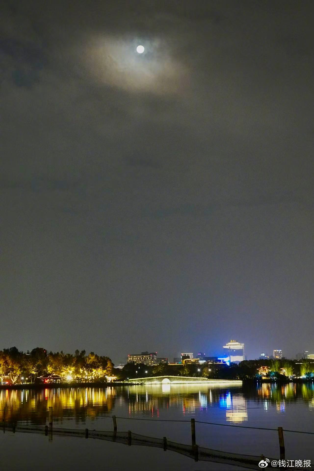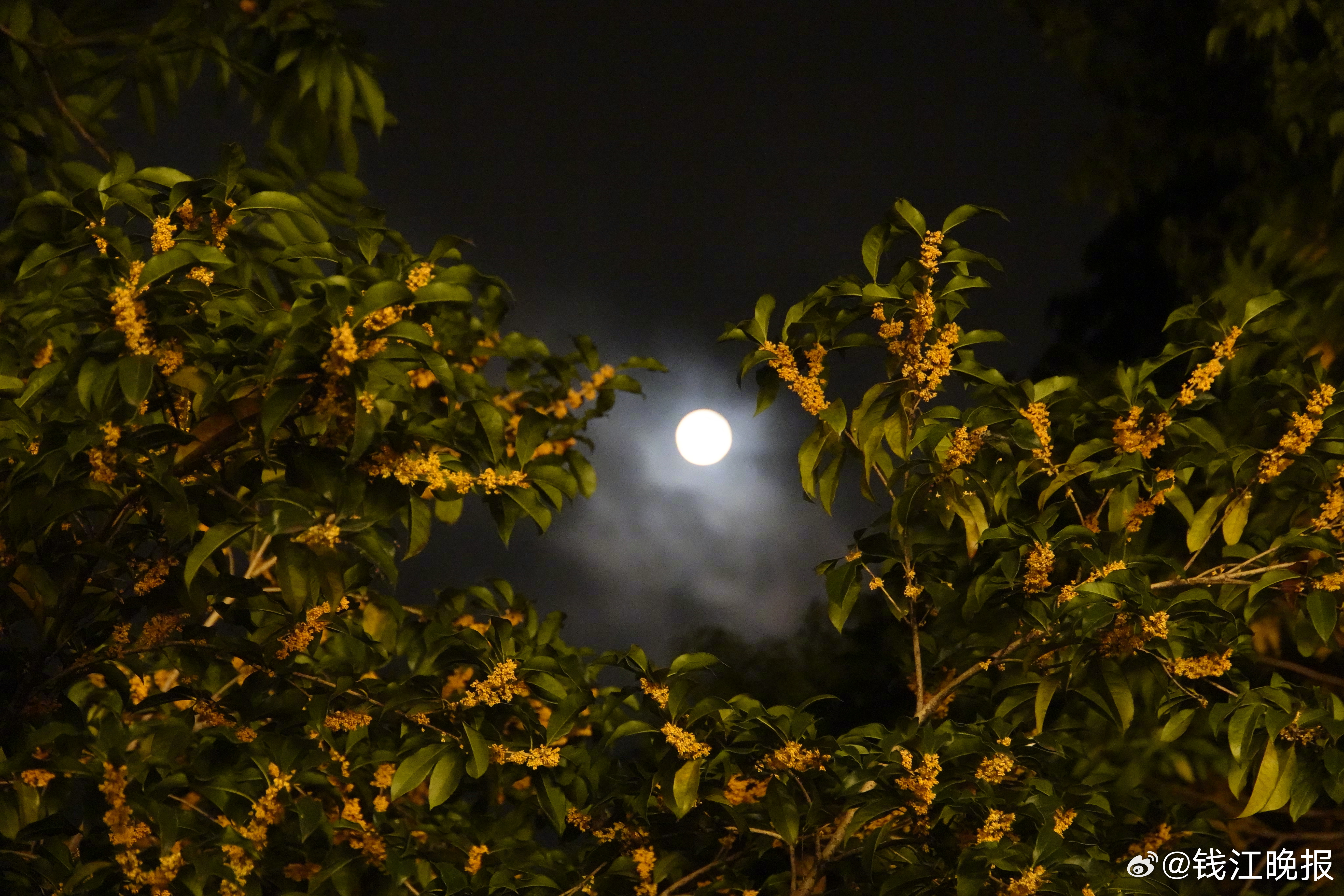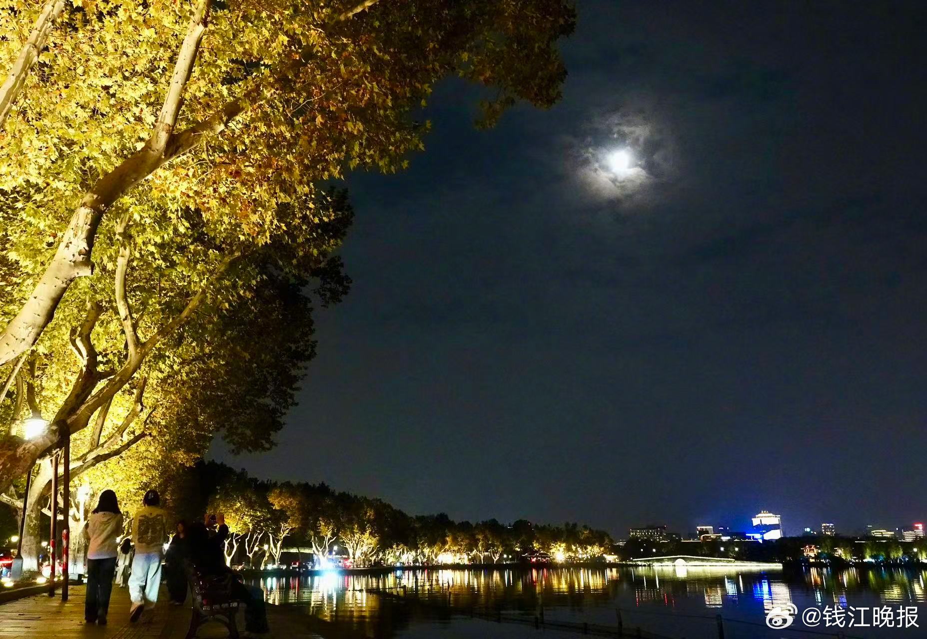 #杭州西湖边现超级月亮#【“超级月亮”霸屏朋友圈】#超级月亮与桂花树同框绝美#今晚,你的朋友圈被“#超级月亮#”霸屏了吗?今天21点19分前后月亮将呈现出最完满的圆形,11月6日6时27分月球过近地点距离地球约35.7万公里,这是2025年所有满月中与地球最近的一次。11月5日晚7时点多,在杭州市西湖景区,超级月亮若隐若现,吸引了游客驻足拍摄。潮新闻记者还拍到了超级月亮与桂花树的同框照。(潮新闻记者 杨晓轩)