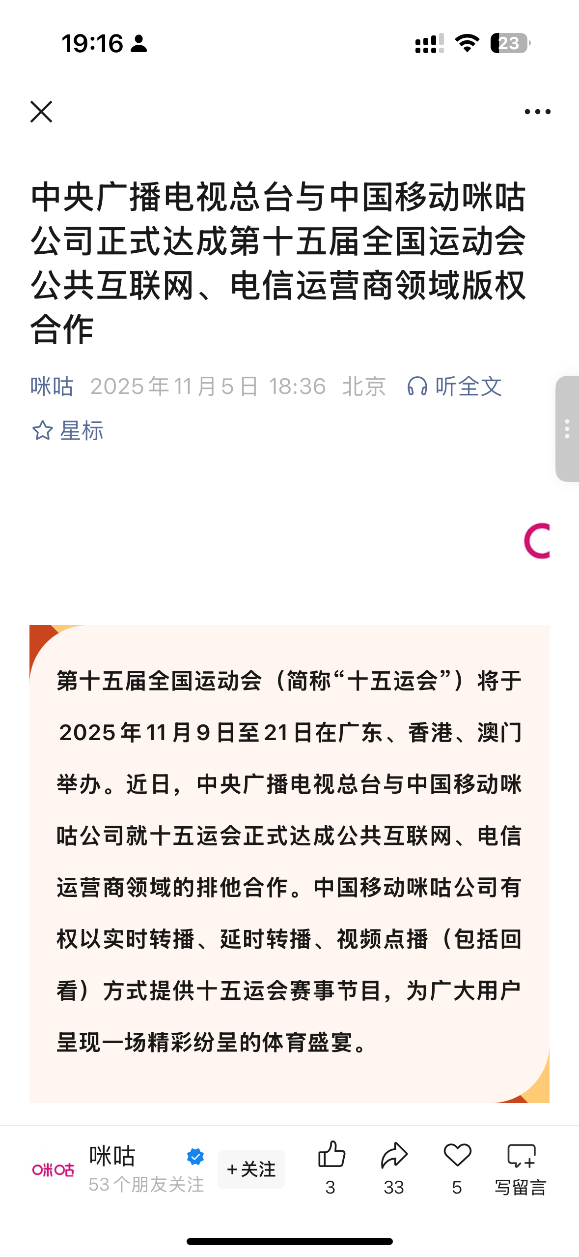 咪咕从央视手里获得全运会版权!虽然不是秘密了,但也算是正式官宣。据我了解,咪咕大概率会有明年世界杯版权,冬奥会版权目前处于待定状态。以我对咪咕的了解,他们最终拿下米兰冬奥会版权也不令人吃惊。