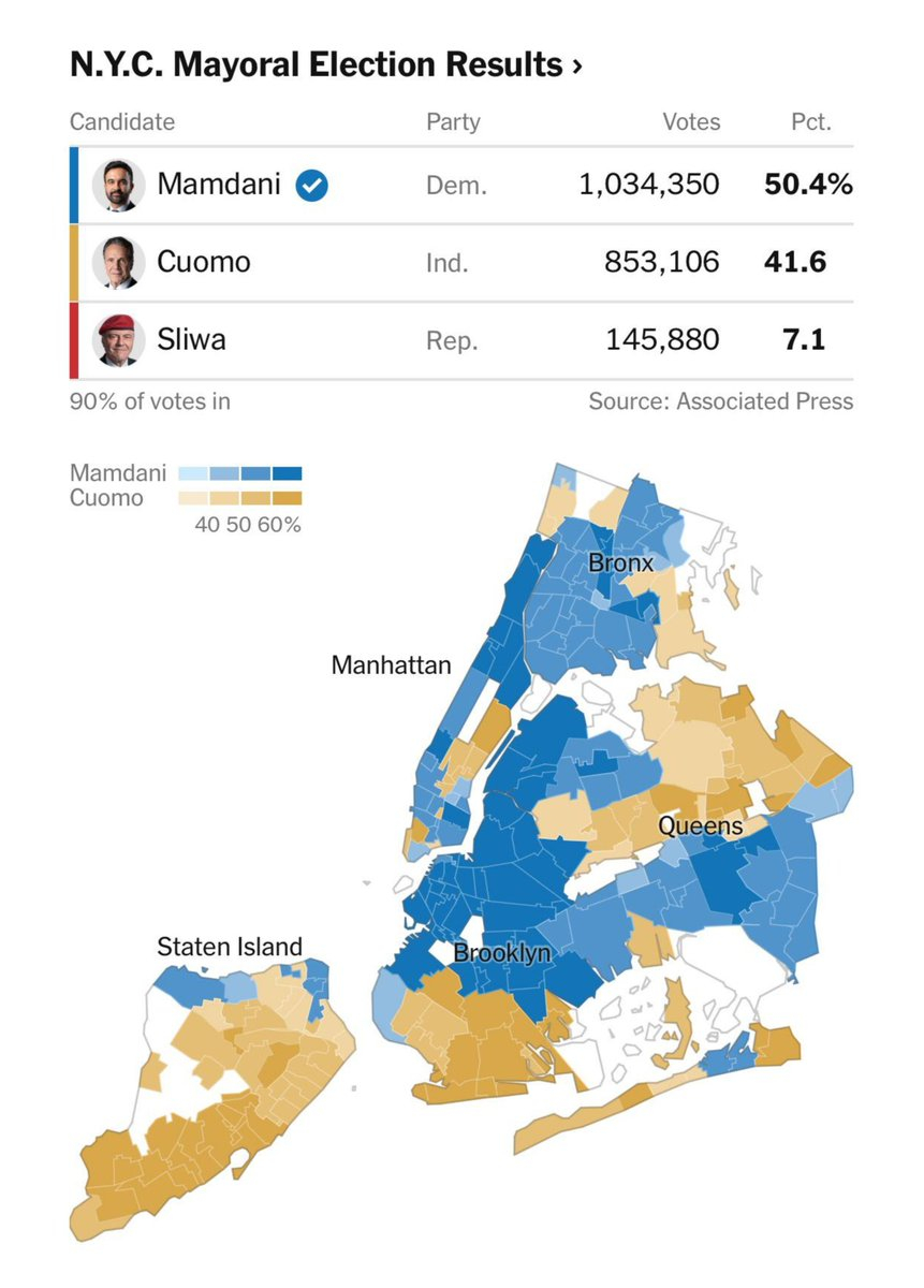 纽约市市长选举结果公布。佐兰·马姆达尼当选为第111任市长,成为该市首位穆斯林市长。