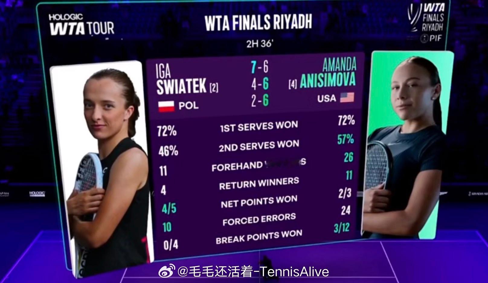 今天阿尼西莫娃打出了小组赛最佳状态。她的接发球实在太无解了。斯瓦泰克其实打的并不差,但是在底线的击球阿尼西莫娃又点势不可挡。今天不断的抢斯瓦泰克,抢的斯瓦泰克喘不过气。在前三板打的实在太太太好了。 接发球制胜分就有11记。