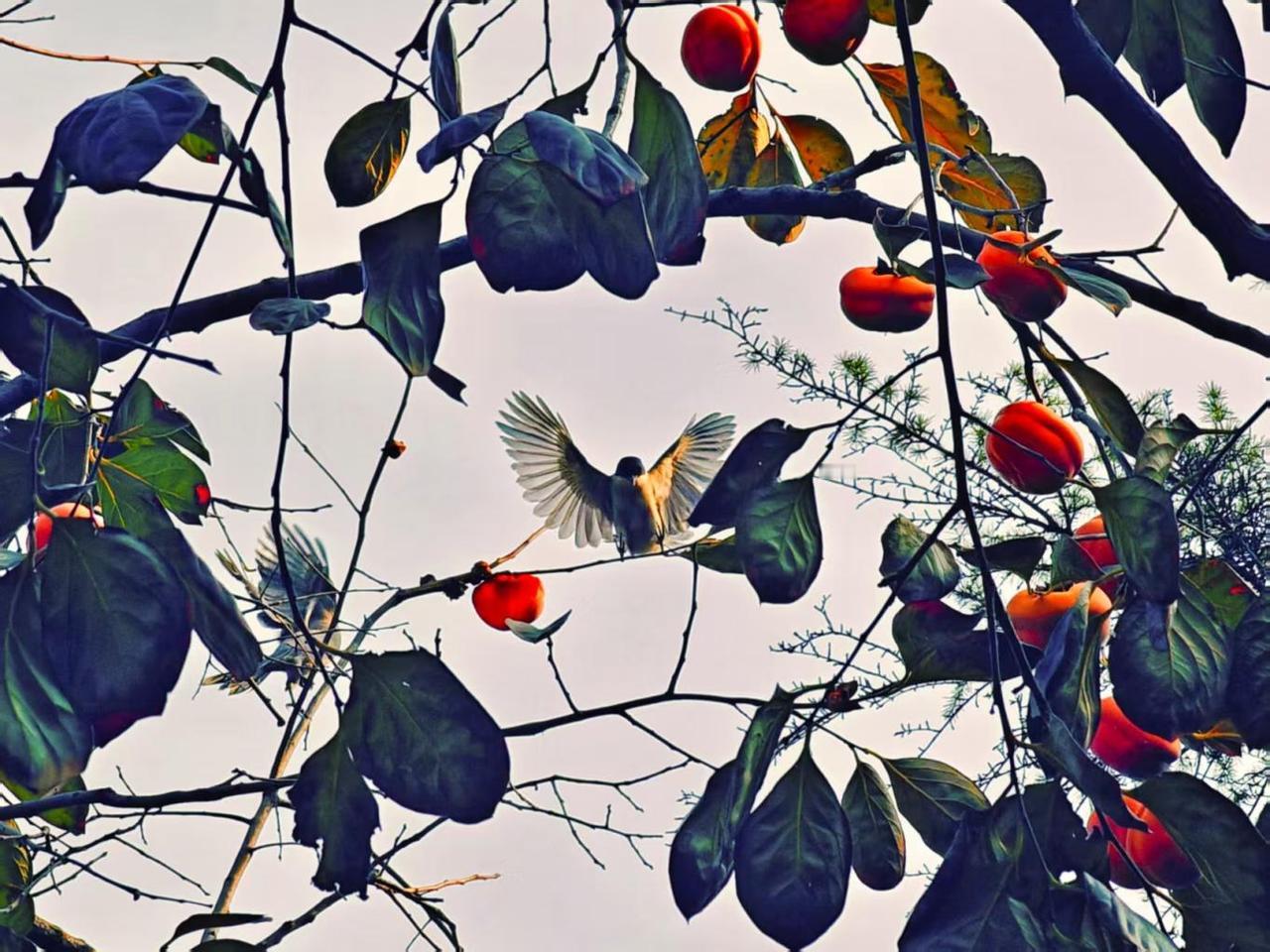 红柿垂露映晴空, 翠叶摇风戏飞鸟。 啄破秋光落灯笼, 七分秋意入画中。 ——《柿