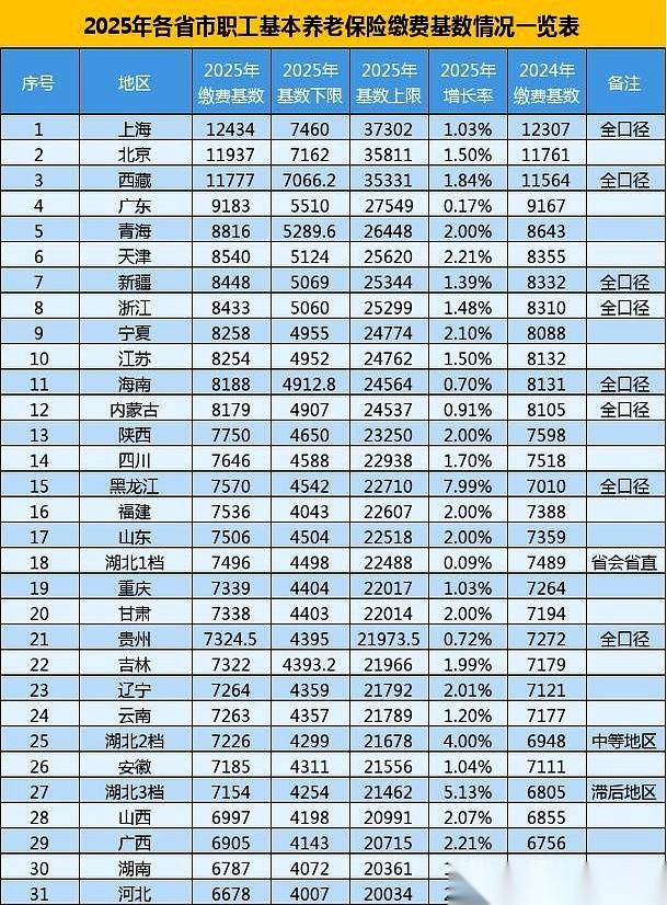 心头一块石头总算落地了。 2025年社保基数这只靴子,全国都掉下来了。万幸,涨得都挺温柔,一个个都跟商量好了似的,基本没超过2%。 我那点死工资,总算能喘口气。 刷着手机看那一串串名单,6字头的,7字头的,8字头的……像不像咱们大学毕业时,奔赴天南海北的同学名单? 有人在月薪6000的城市安稳度日,有人在月入过万的地方拼命内卷。 有人说,你看,最高的和最低的,差距不到两倍,不大。 我心想,这哪是数字啊。 这是咱们每个月到手工资的区别,是房价的差距,是楼下那碗面条差出来的好几块钱。这是活生生的人间。 你交6000的基数,他交9000的基数,每个月从工资条上划走的那笔钱,是实打实的肉疼。 但转念一想,又觉得挺安心。 这笔钱,不就是给几十年后那个老胳膊老腿的自己,存的一份养老底气么? 给未来的自己,买一份确定性。 日子嘛,就是这样。一边算计着眼前的柴米油盐,一边又得给遥远的未来铺路。 就这么熬着,也盼着。